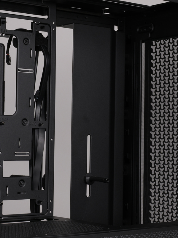 このカバー部は、実は取り外しが可能。付属のサイドファンマウントに付け替えることで、ここに360mmラジエーターの取り付けや、ケースファンの増設が可能になる。こちらも、実際に組んだ写真を見てもらいたい。