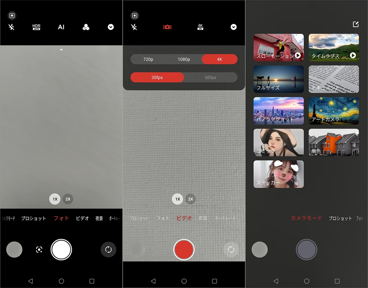 カメラのUIはシンプルで、写真モードでは1倍と2倍のみ、デジタルで最大10倍撮影が可能だ。動画は4K 30fpsまでに対応する。一方でモードやエフェクトは複数搭載しており、これは上位モデルとなる「nubia Z70 Ultra」などカメラフォンの機能をそのまま搭載している。