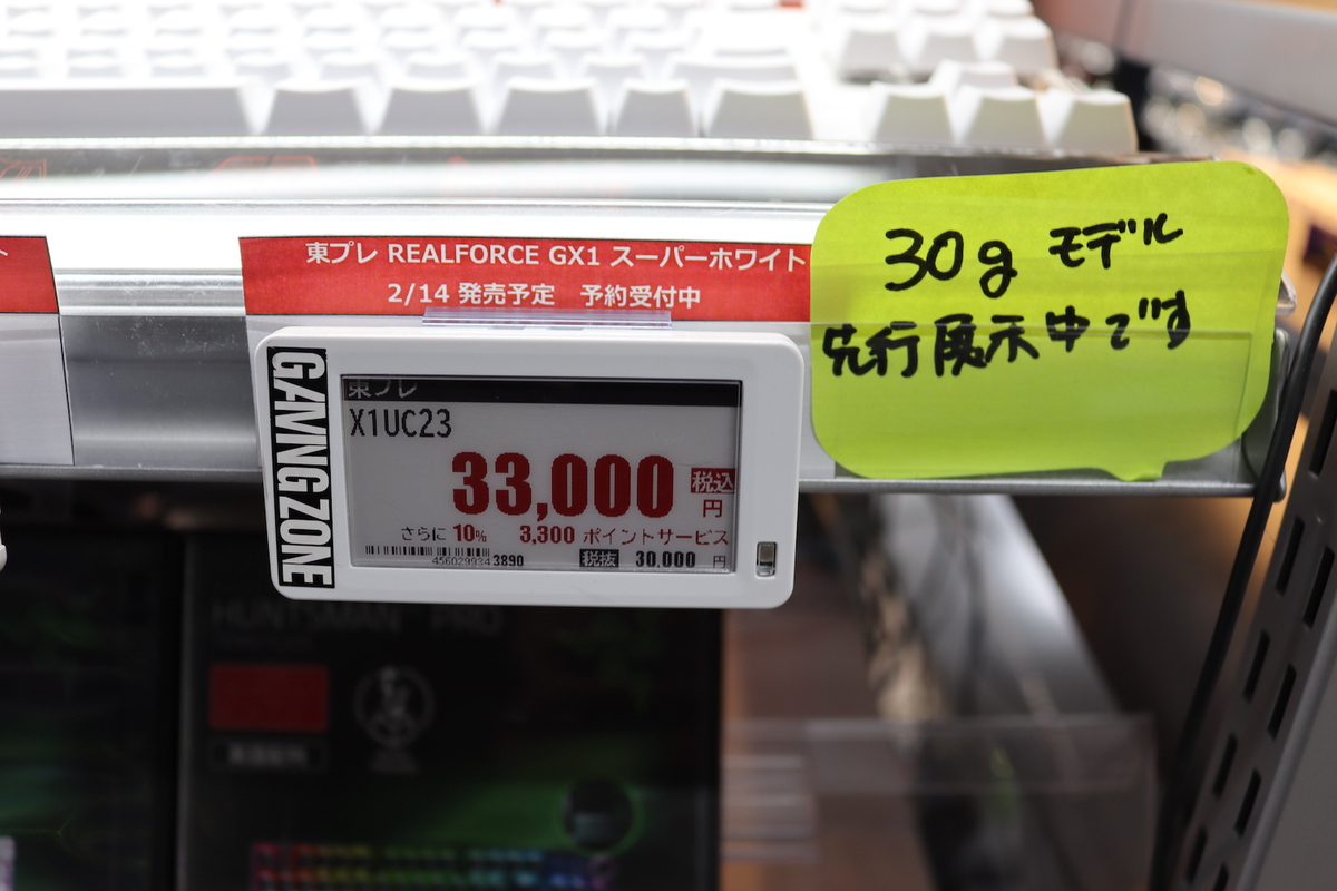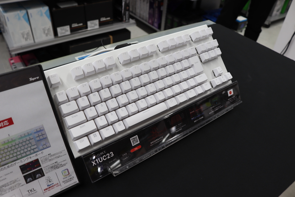 取材したのは発売日前日でしたが、ソフマップ なんば店ではサンプルを先行展示していたので、実際に触ってみました。展示棚には押下圧45gのモデルも並んでいるので、押下圧の違いも確認できます。
