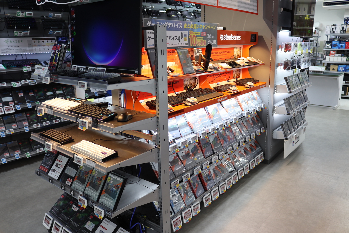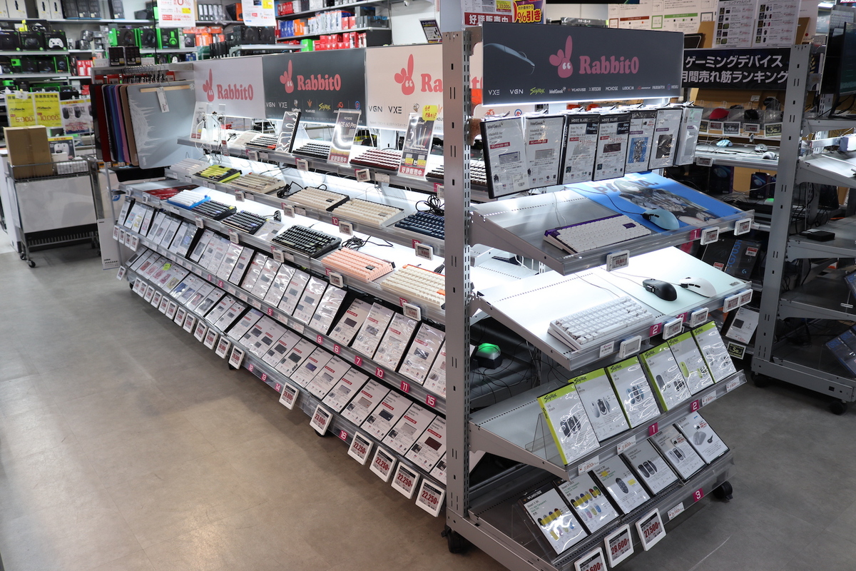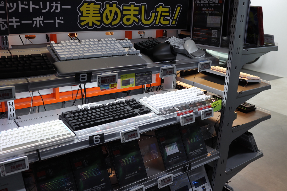 ソフマップ なんば店3Fのキーボード売り場は、発売前の製品をよく先行展示しており、とても充実している印象です。つい最近もキーボード売り場を拡張したといいます。ゲーミングキーボードに興味がある人はぜひ足を運んでみてください!