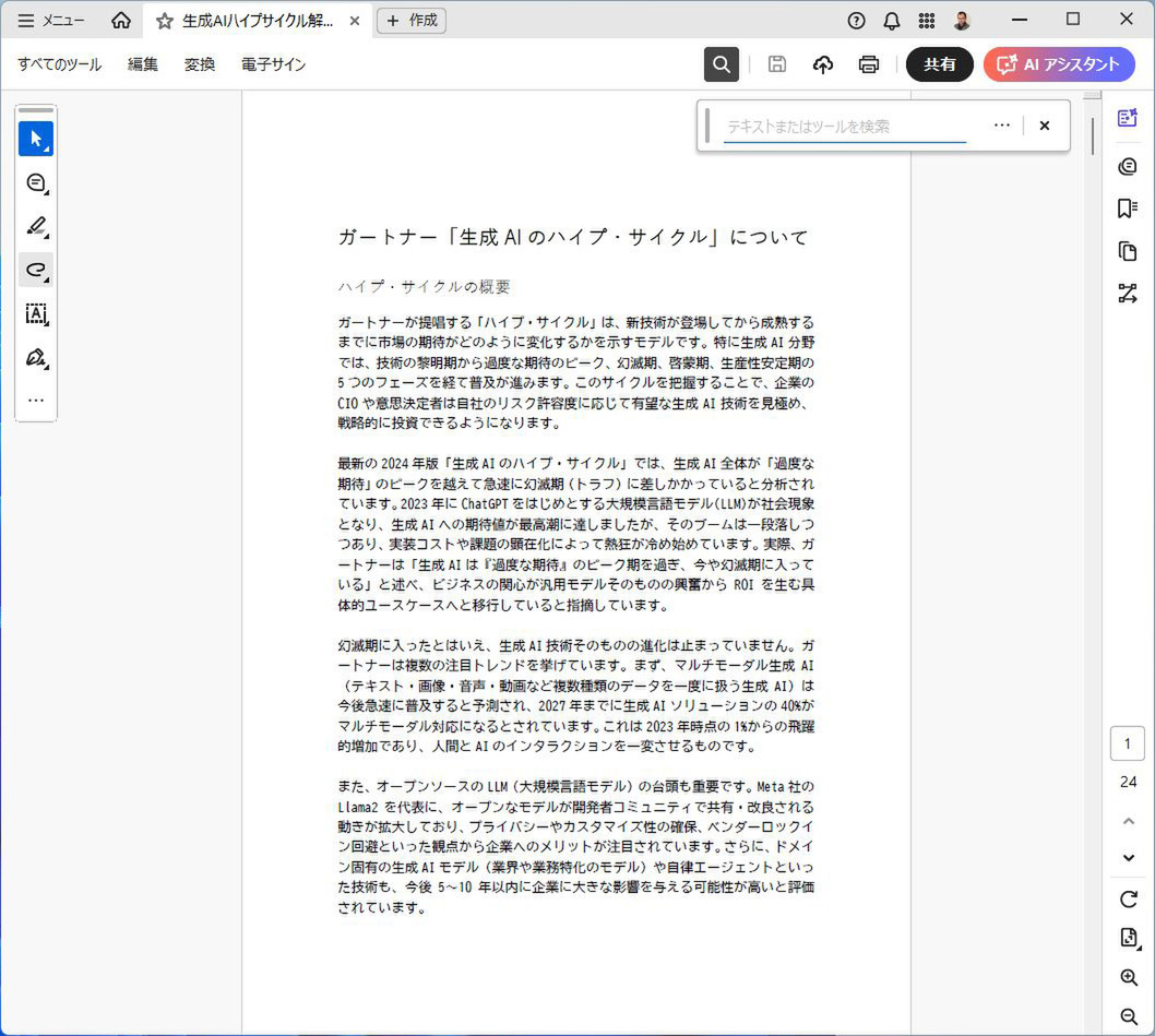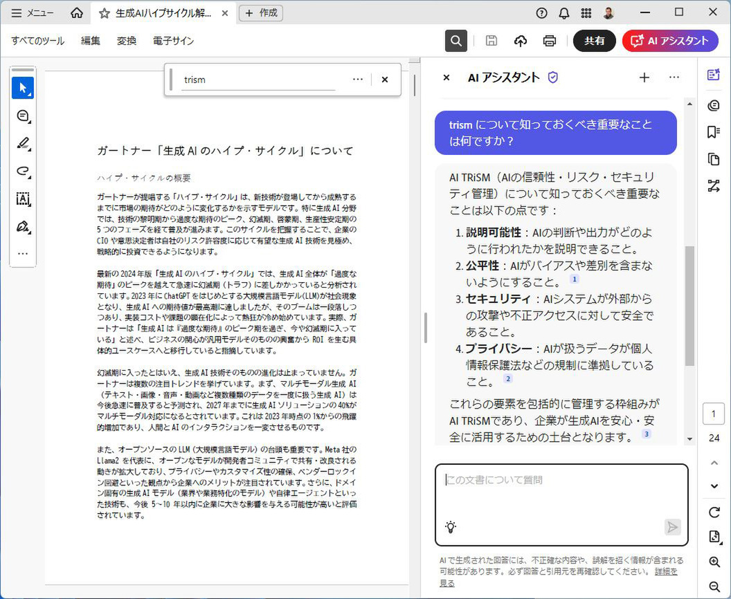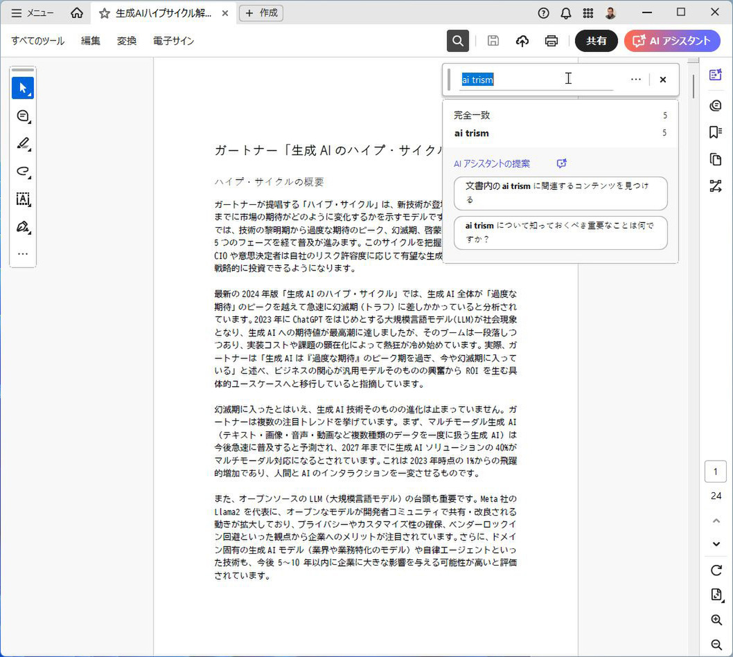 検索フォームに探したいキーワードを入力すれば、Acrobat AI アシスタント(以下、AI アシスタント)を持っている人は完全一致する箇所の数や入力する提案キーワードが表示される。「AI TRiSM」の「rism」など一部の文字を入力する場合は、リアルタイムには検索しないものの、Enterキーを押せば検索できる。