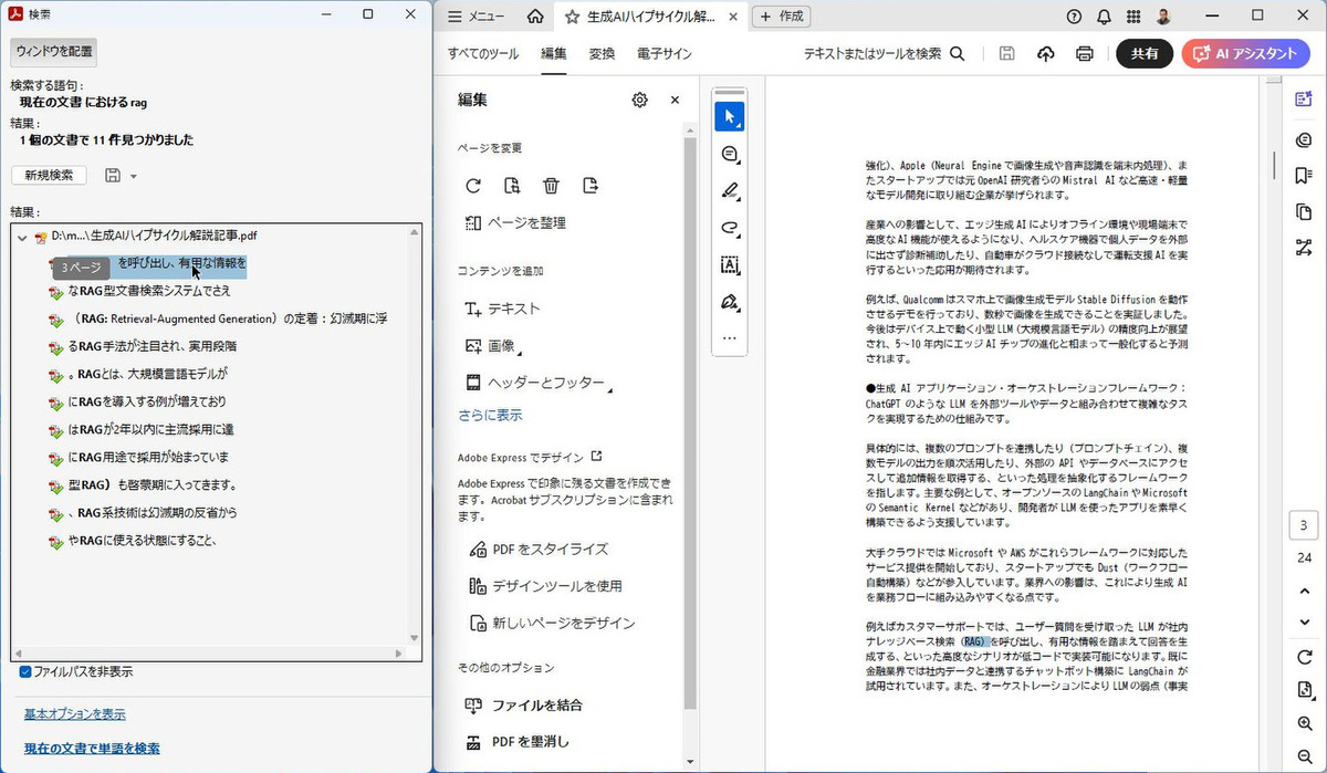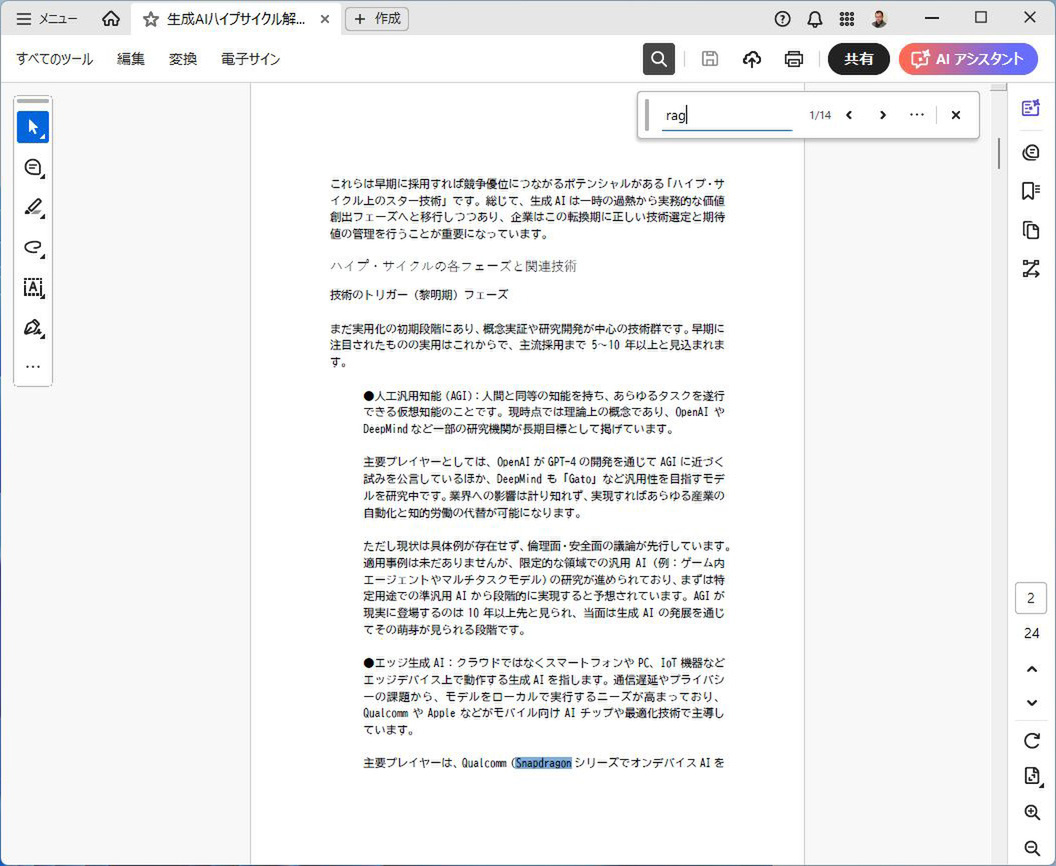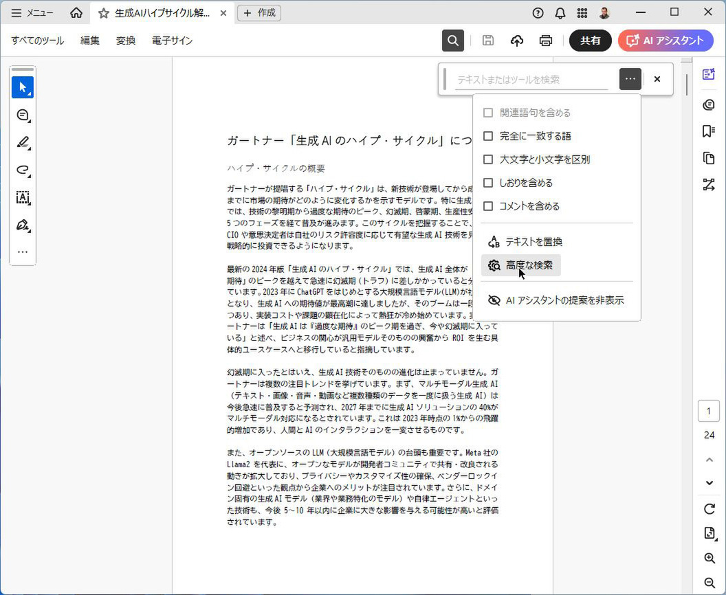 「簡易検索」フォームの右側にある「…」をクリックし、「高度な検索」をクリックしよう。検索ウィンドウがAcrobatの左側に現れる。開いている文書を検索するなら、「現在の文書」を選択したまま、キーワードを入力。「完全に一致する語のみ」にチェックして検索してみよう。「Snapdragon」や「GraphRAG」といった単語はヒットしなくなる。