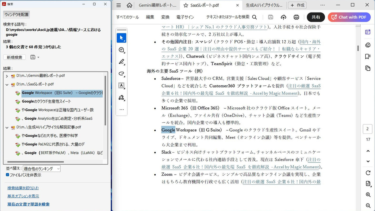 研究者、法律関係者、企業のドキュメント管理担当者など、大量の文書を扱う職種にとってはとても便利な機能だ。通常、PDFファイルは個別に開いて検索しなければならず、複数の文書にまたがる情報を探す際には手間がかかる。フォルダを指定するだけで、過去の文献や契約書、仕様書、議事録など、大量のPDFから必要な情報を素早く見つけられるのはありがたい。