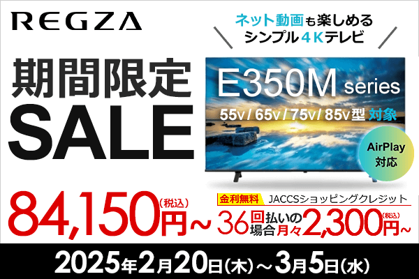 このセールで注目の一台として紹介されているのは、55V型の「55E350M」だ。価格は8万4150円となっており、ソフマップのJACCSショッピングクレジットを利用することで、金利0円の最大36回払いが可能だというので、手が届きやすくなっている。なお、セールは3月5日までの期間限定で提供されている。