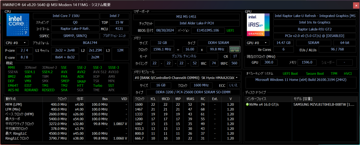 続いて、性能面を見ていこう。CPUはインテル Core プロセッサー 150Uを搭載。10コア(2P+8E)/12スレッドで最大動作周波数は5.4GHz、ベースパワーは15Wとなっている。メモリーは、標準で32GB DDR4だがMSI公認サポート店なら最大64GBまで増設可能だ。ストレージは、M.2 NVMe SSD 1TBと余裕の容量で、これだけあれば早々に逼迫することはない。