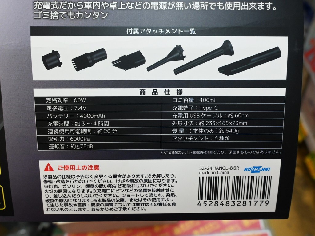 出力は60Wで吸引力は60,000Paというスペック。掃除機およびエアダスター用のアタッチメントは、それぞれ3種類ずつ合計6種類が付属する。充電時間は約3~4時間で、連続使用時間は約20分。使用時の騒音は約75dB以下で吸引側に備えるゴミタンクの容量は400mlとなっている。