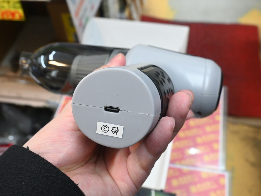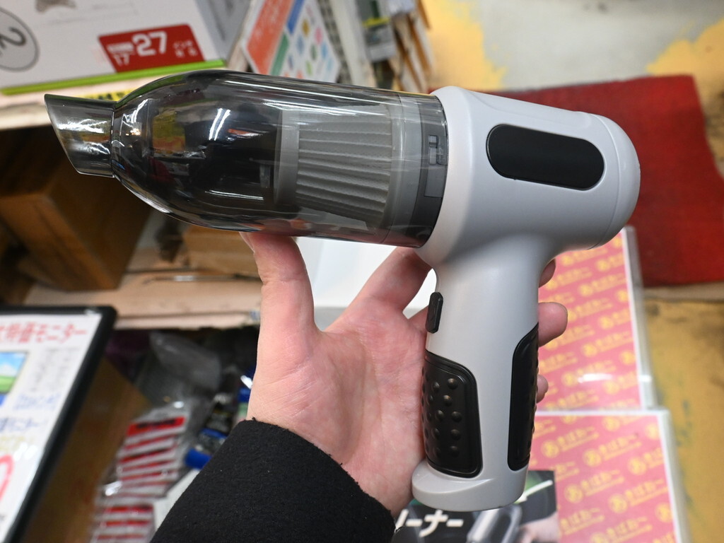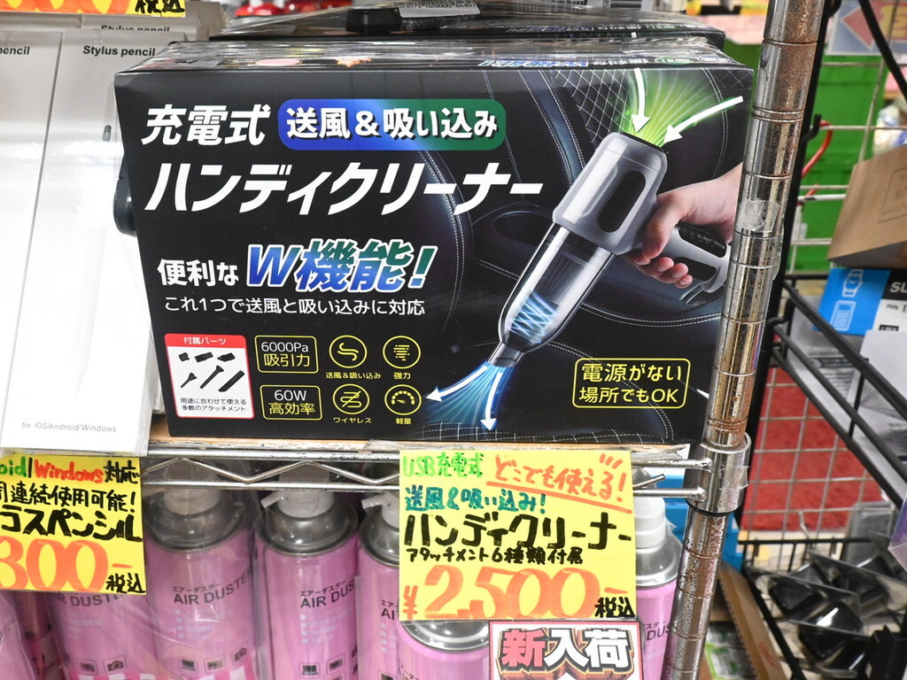 エアダスターと掃除機の機能を備えた「充電式 送風&吸い込みハンディクリーナー」(型番:SZ-24HANCL-BGR)が発売。あきばお~各店では2500円で販売中だ。