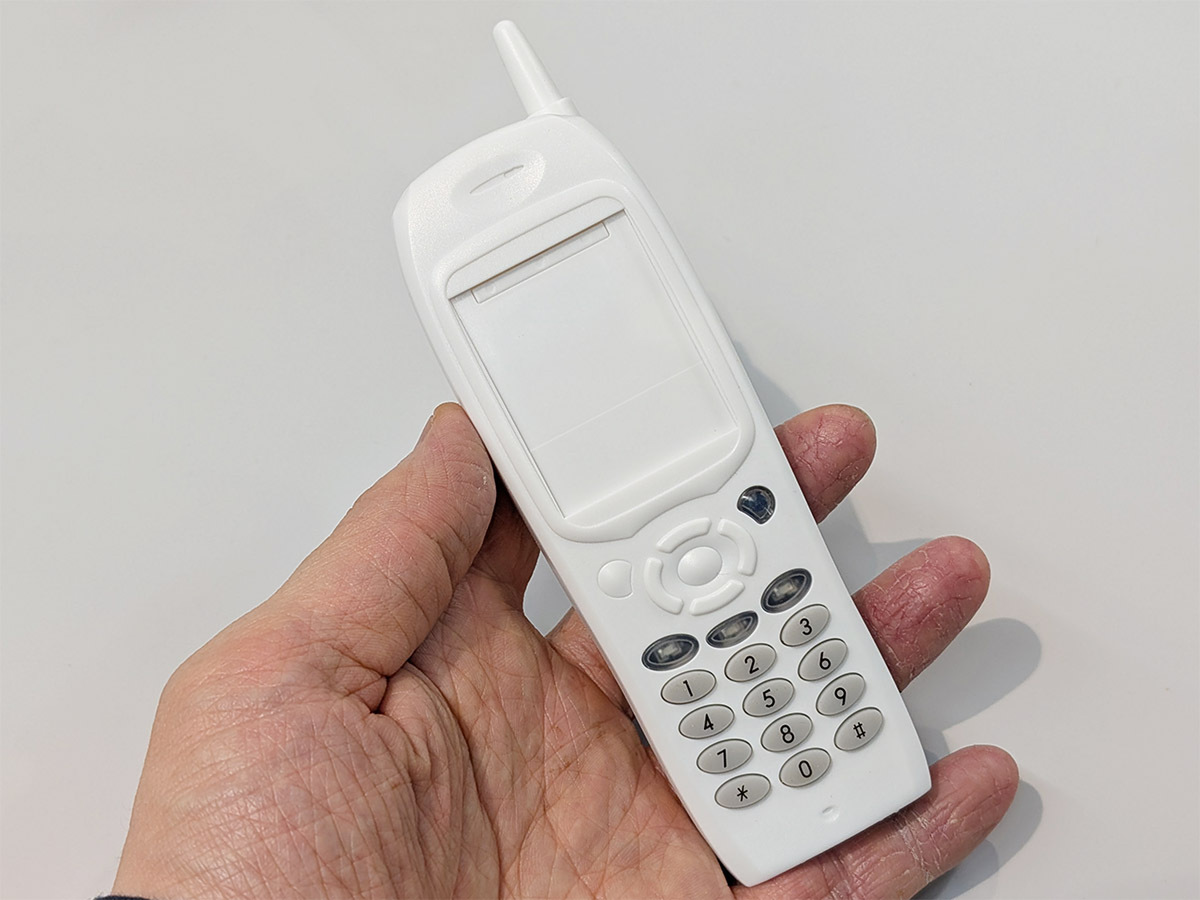 編集部では、実際の付録をいち早く触ることができたので外観を紹介しよう。外装は白いプラスチックでもちろん当時のF502iとは印象が異なるが、形自体は当時そのまま。そして本体底部にはBluetoothのオン/オフスイッチを装備しており、PCやタブレットと接続が可能。当時のF503iはBluetooth機能を備えていなかったので、この点では高性能だと言える。