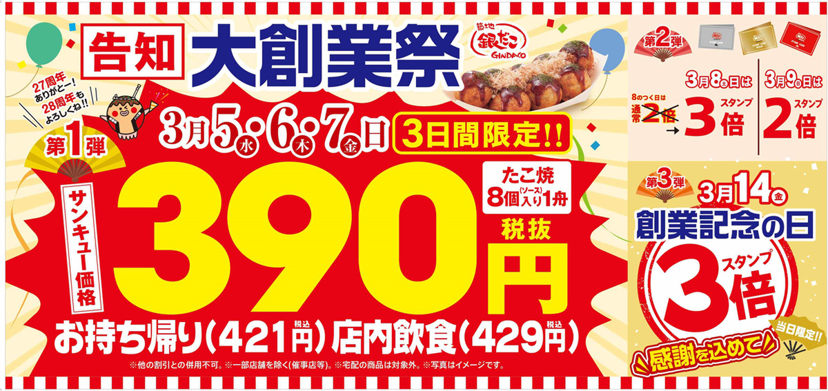 築地銀だこ「大創業祭」たこ焼き8個が税抜390円!3月5日から! 3月8日はスタンプ3倍!🐙