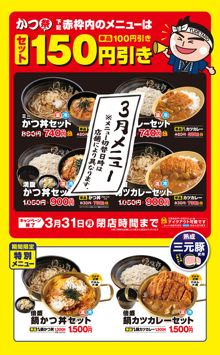 ゆで太郎「かつ祭」3月いっぱい開催! カツ丼・カツカレーがセット150円引き、単品100円引き!