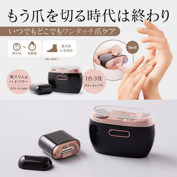 業界最小クラスながらハイパワーを誇り、3役(爪研ぎ・磨き・皮ケア)を1台でこなします。赤ちゃんから高齢者まで、安心して使える防護設計が施されています。コンパクトサイズで持ち運びに適しており、化粧ポーチにもすっきり収納可能です。
