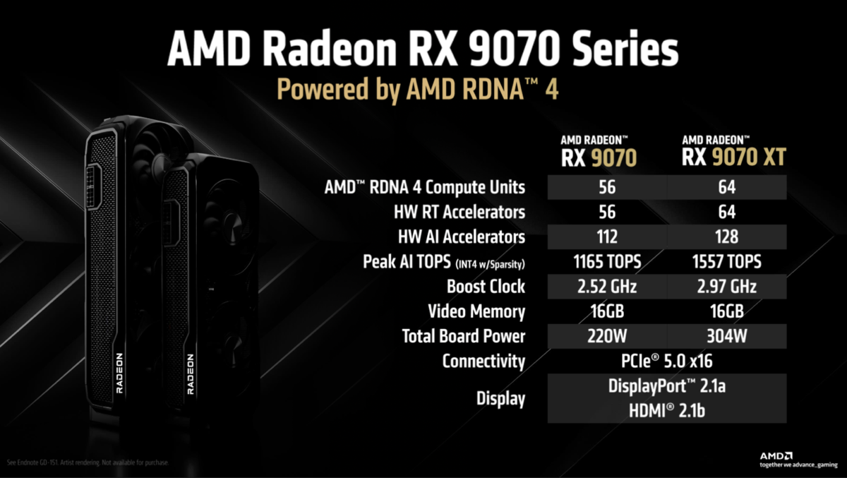 RX 9070シリーズの主なスペックも発表された。RX 9070 XTはCU(Compute Unit)64基でTBP(Total Board Power)は304W、RX 9070はCU56基でTBP 220W。ともにVRAMはGDDR 6の16GB仕様であり、PCI Express Gen 5対応となる。RTX 40〜50シリーズの上位モデルではより高速なGDDR6XやGDDR7を採用していることから考えるとRX 9070シリーズのGDDR6は周回遅れ感があるが、当のNVIDIAも新メモリーの歩留まりに苦労している事を考えると調達しやすさやコスト的な問題からGDDR6に止まったようだ。