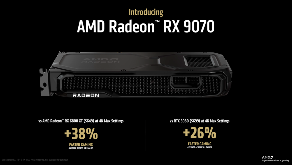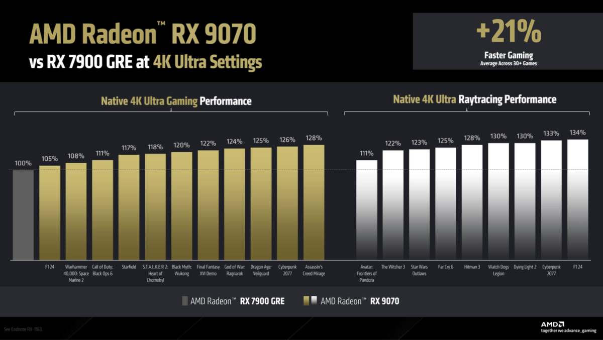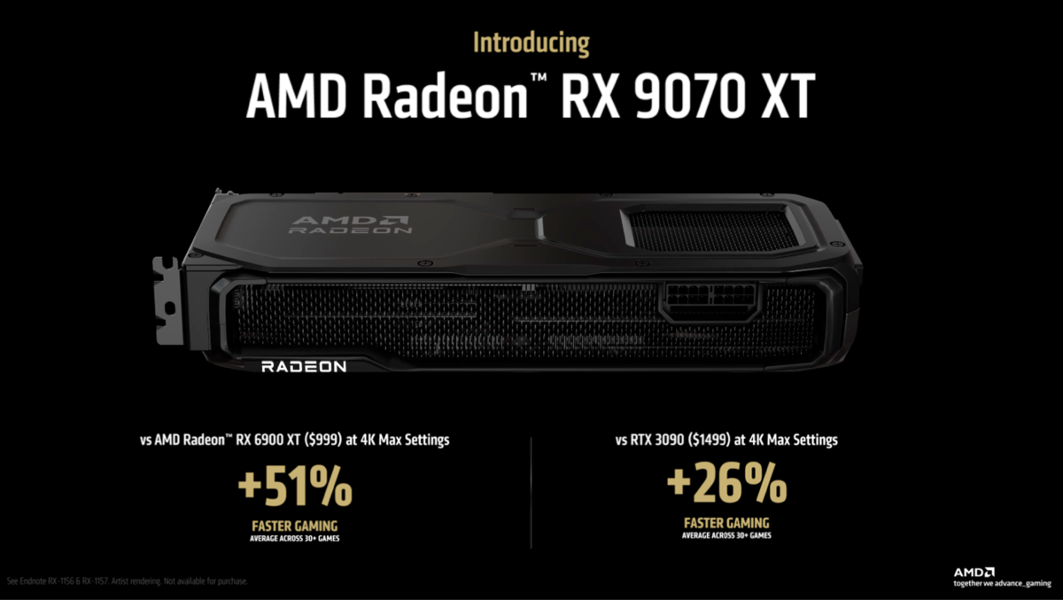 前置きが長くなったが、RX 9070シリーズはNVIDIAのRTX xx70番に対抗するための製品であり、RX 7900 GREとRX 7900 XTの中間に位置付けられる。RX 7900 GRE(発表時549ドル)がWQHDゲーミング向け、RX 7900 XT(同899ドル)が4Kゲーミング向けであるが、RX 9070シリーズは4Kゲーミングの性能をRX 7900 XTより安く提供できる。価格以外の進化の方向性としては、前世代よりもレイトレーシングやAIのパフォーマンス強化も志向しているが、これは近年のトレンドを考えれば当然といったところだ。