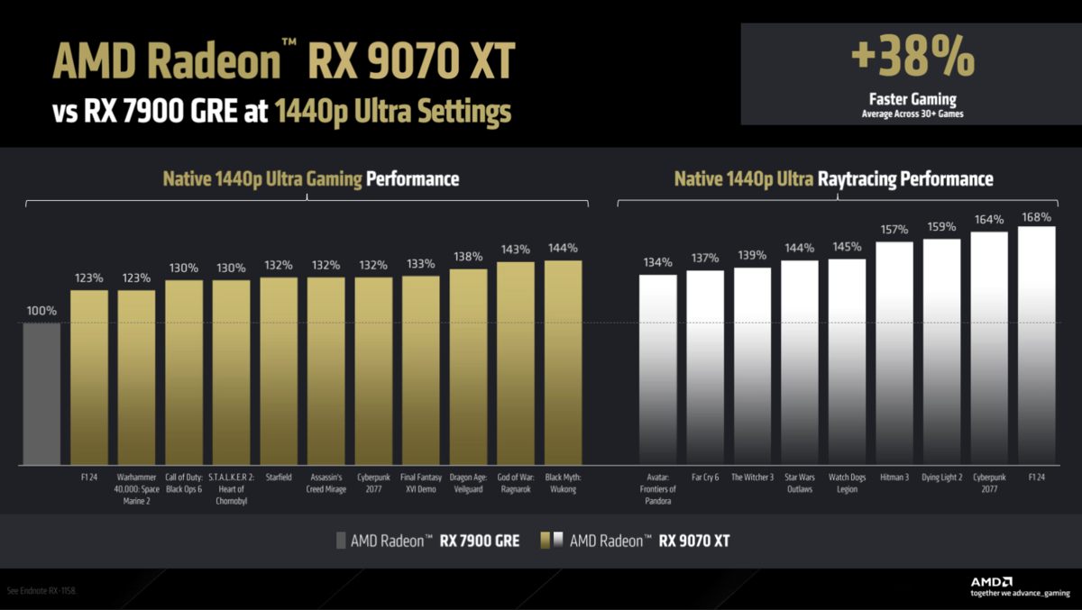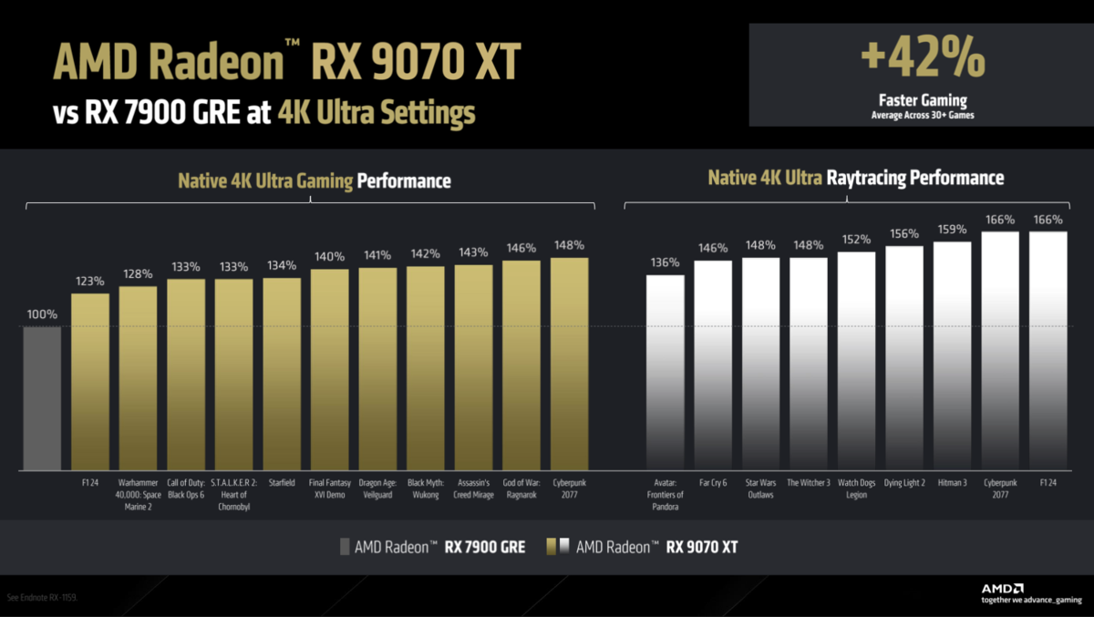 RX 9070シリーズとRX 7900シリーズとの比較については、RX 7900 GREと対決させたデータしか公開されていない。どんな状況でも確実かつ見映えのする性能向上が期待できるのはRX 7900 GREだけであるということだろう。それによればRX 9070ならば4K&最高画質設定で21%、WQHDならば20%向上し、RX 9070 XTならば4Kで42%、WQHDならば38%向上するという(いずれも30本以上のゲームにおける平均)。