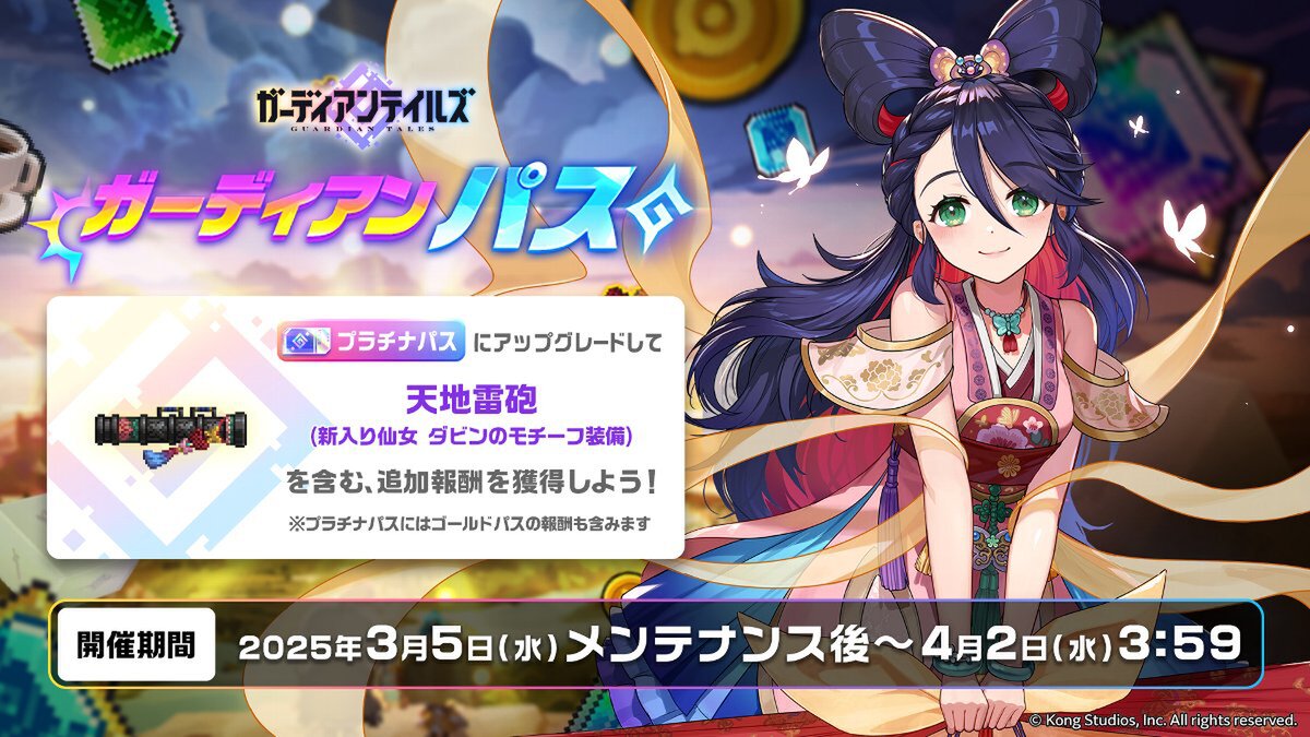 ガーディアンパスの新シーズンを開始した。プラチナパスおよびゴールドパスを購入することで、無料召喚アイテムや、下記のモチーフ装備などの報酬が入手可能に。ミッションをクリアしてもれなくゲットしよう。開催期間は、2025年3月5日メンテナンス後~4月2日13時59分まで。