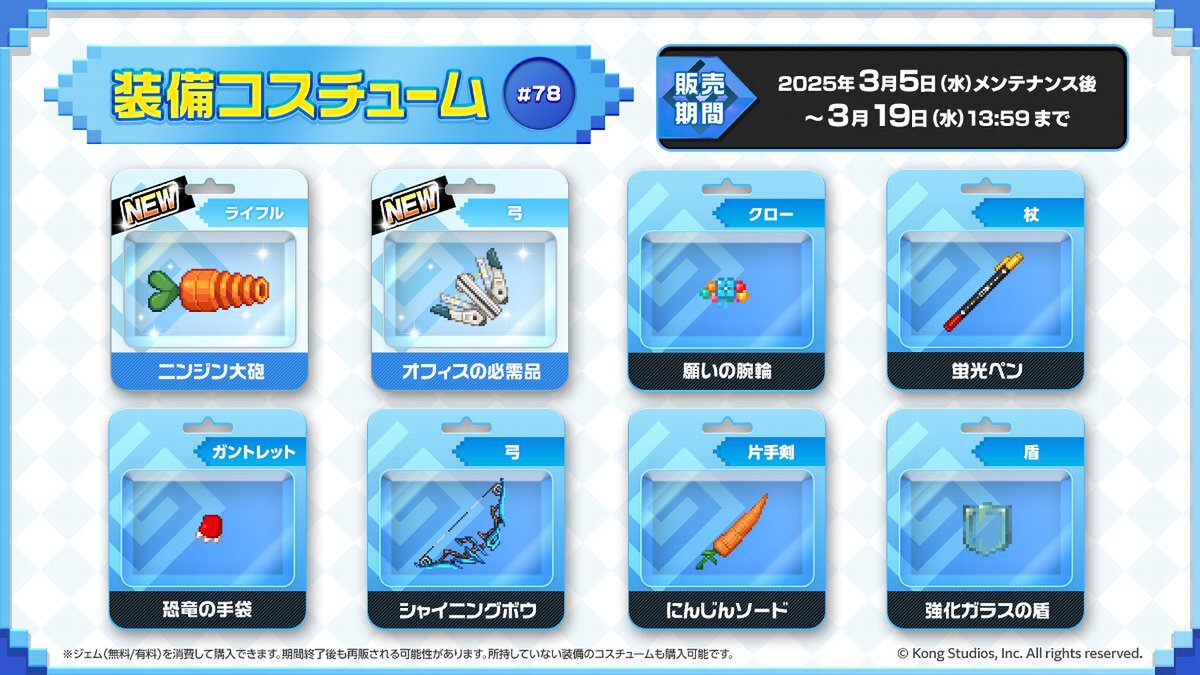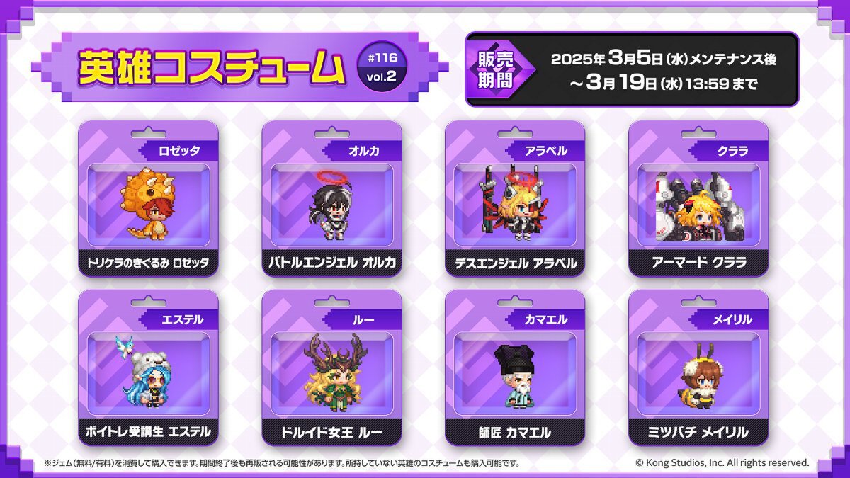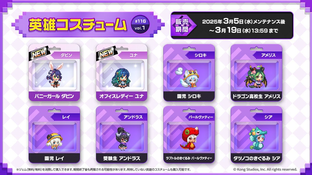 英雄および装備の新規コスチュームがショップに登場。既存のコスチュームの一部とあわせて期間限定で販売される。この機会にぜひ英雄たちのおしゃれを楽しもう。販売期間は、2025年3月5日メンテナンス後~3月19日13時59分より。