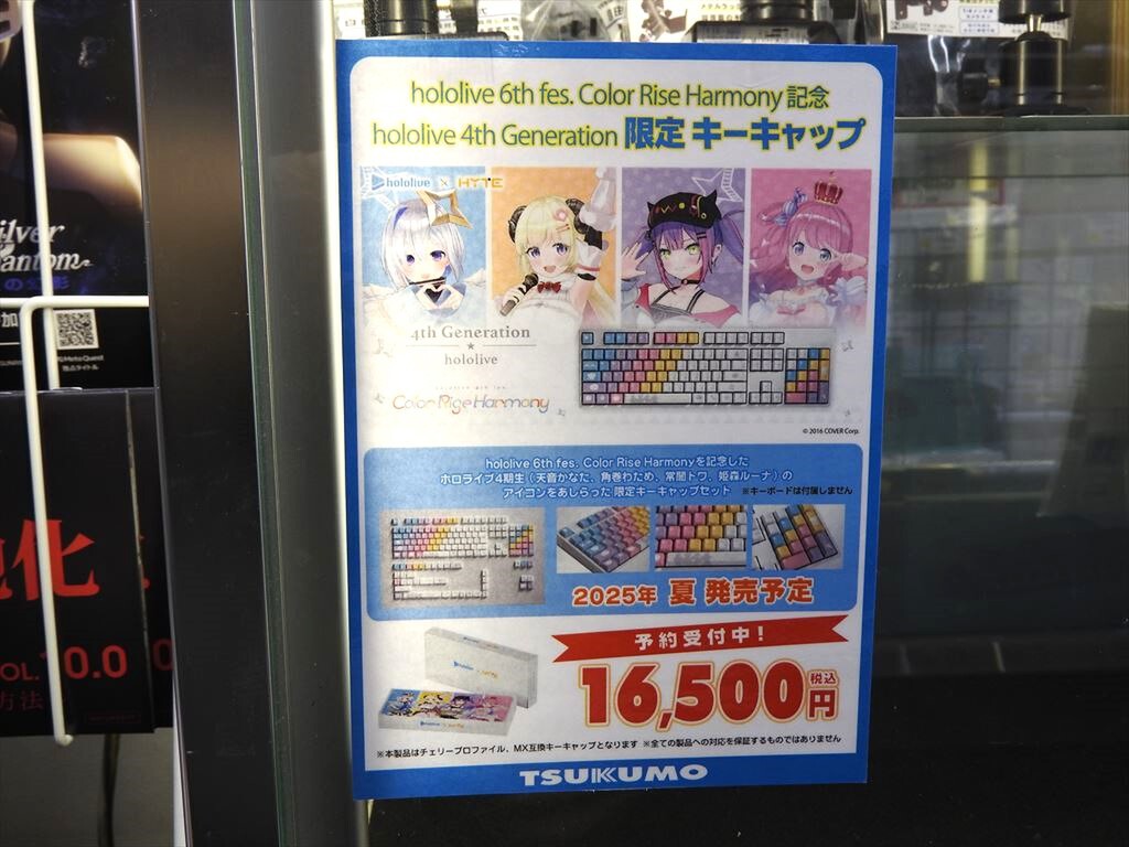 HYTEとホロライブがコラボレーションした限定キーキャップ「HYTE hololive Gen4 Keycaps」の予約受付がスタート。場所はツクモパソコン本店。発売は2025年夏の予定で、予価は1万6500円だ。