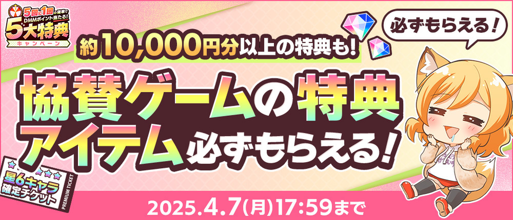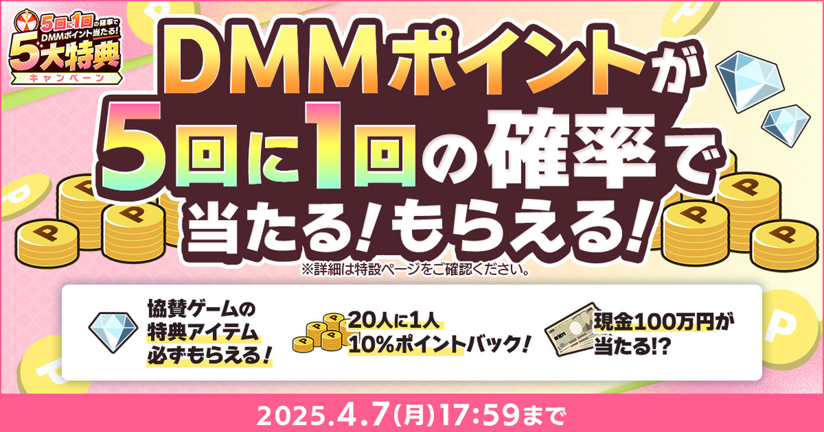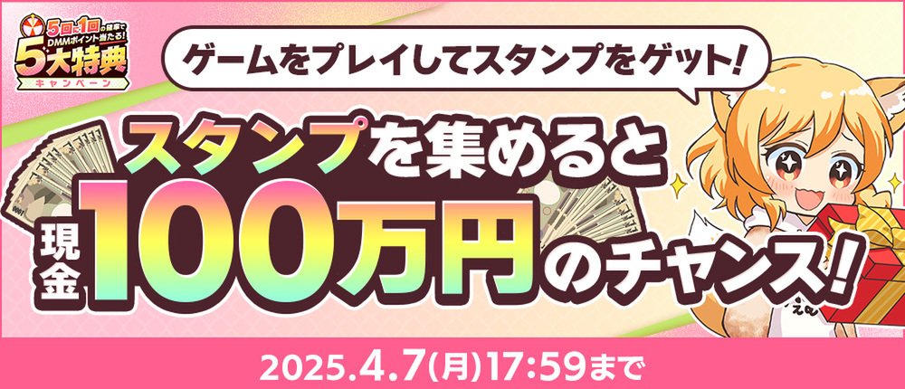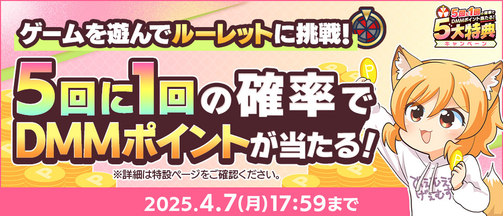 2025年3月7日から4月3日までの28日間、スマホブラウザタイトルをプレイで、ルーレットメダルやDMMポイントがもらえる。