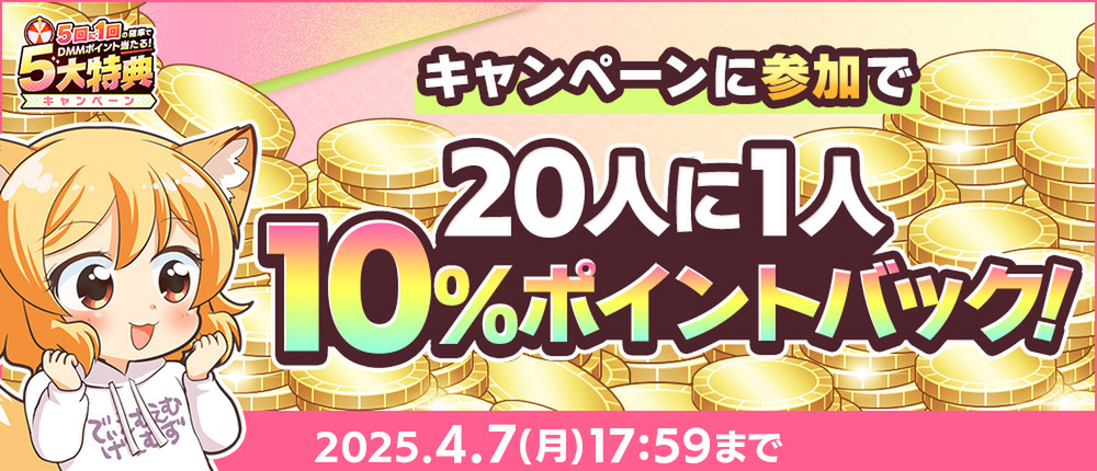 キャンペーン期間中にDMMポイントをDMM GAMESで消費すると抽選で20人に1人、消費した10%分のDMMポイントが還元される(最大3000DMMポイントまで)。