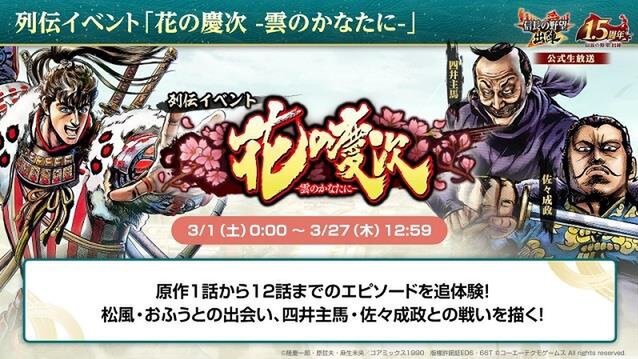 列伝イベントは、歴史上の有名な合戦などをテーマにした物語を追体験しながら、強者(つわもの)との合戦を通して各種報酬の獲得を目指すイベント。現在、「花の慶次 –雲のかなたに-」とのコラボ列伝イベントを実施中だ。