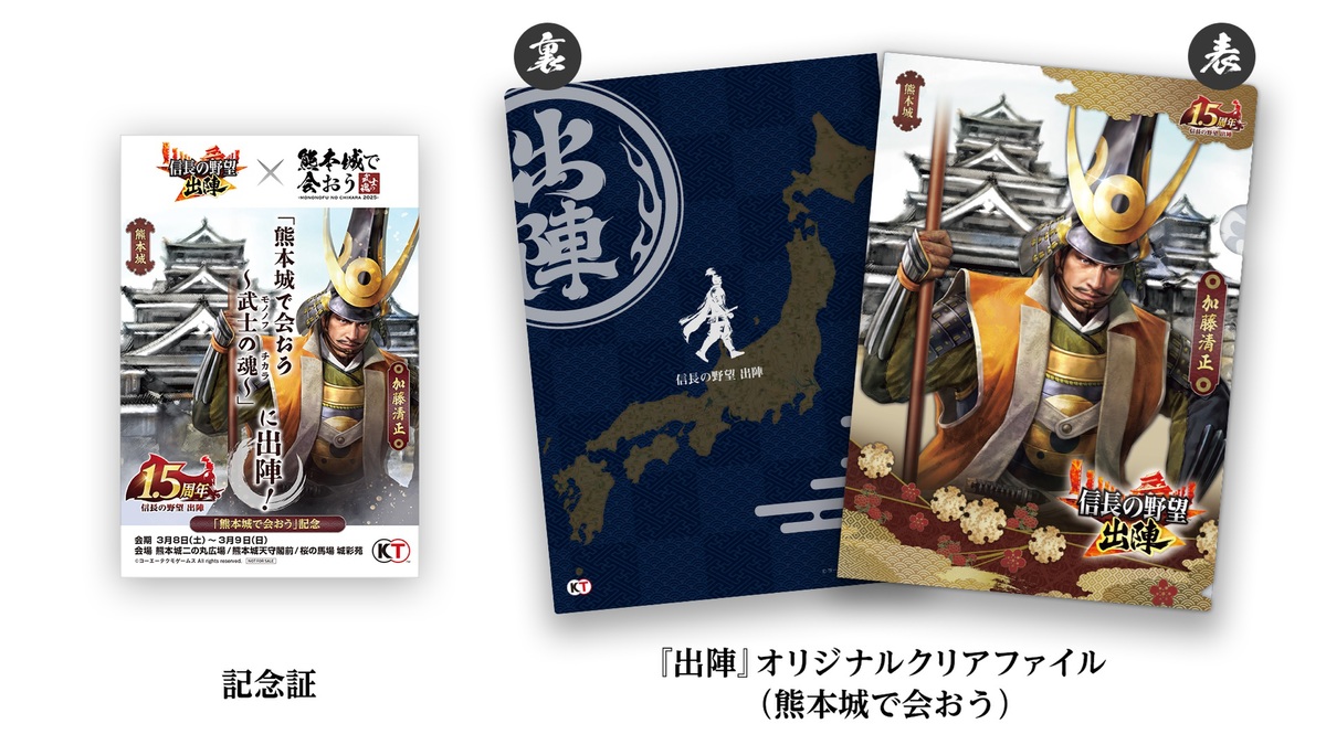 ご当地イベントの参加特典として、期間限定ミッション達成で記念証と『出陣』オリジナルクリアファイル(熊本城で会おう)をプレゼント。記念証の裏面にはシリアルコードが記載されており、案内にしたがってシリアルコードを入力すると登用札5枚を獲得できる。
