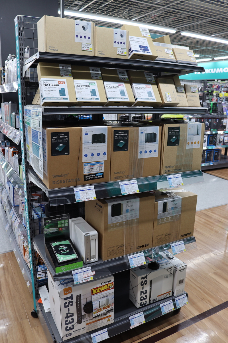 以前の取材時は、店頭在庫がさみしかったNASコーナーの品揃えが、今回の取材時は充実していました。ツクモLABI1なんば店はNAS製品にも力を入れているので、NAS構築に興味のある人はぜひ店舗で相談を!