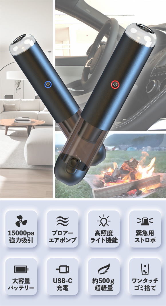 バキュームクリーナーは、多機能を備えた革新のクリーニングツールです。ブロアーやライト付きで、車内のポケットやドリンクホルダーにも置けるコンパクトデザインが特徴的です。軽量さを維持しつつ、15000Paの強力な吸引力でどんなゴミも逃しません。