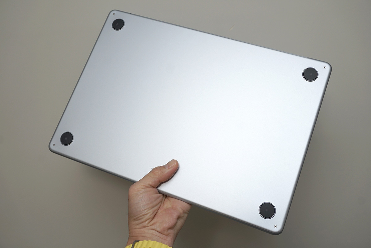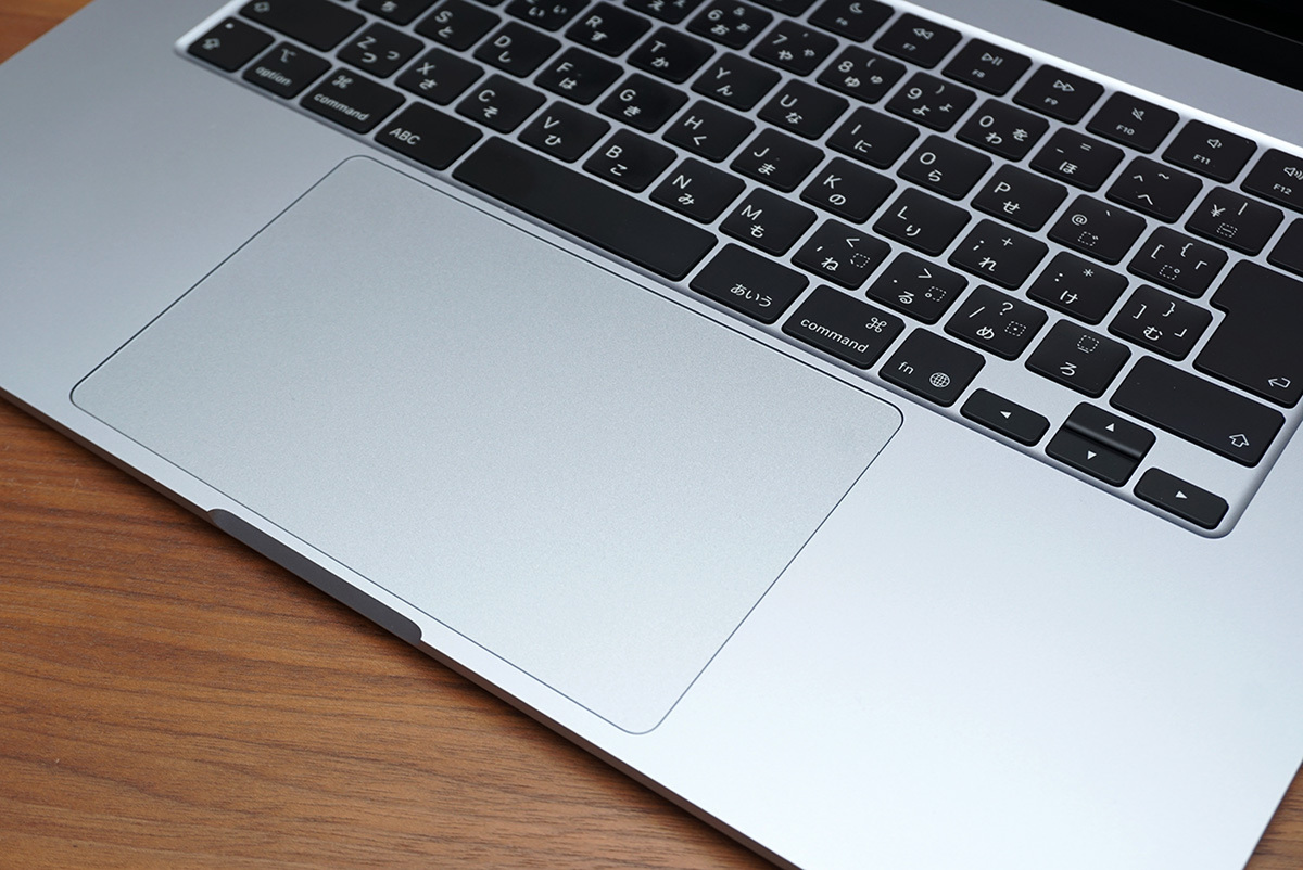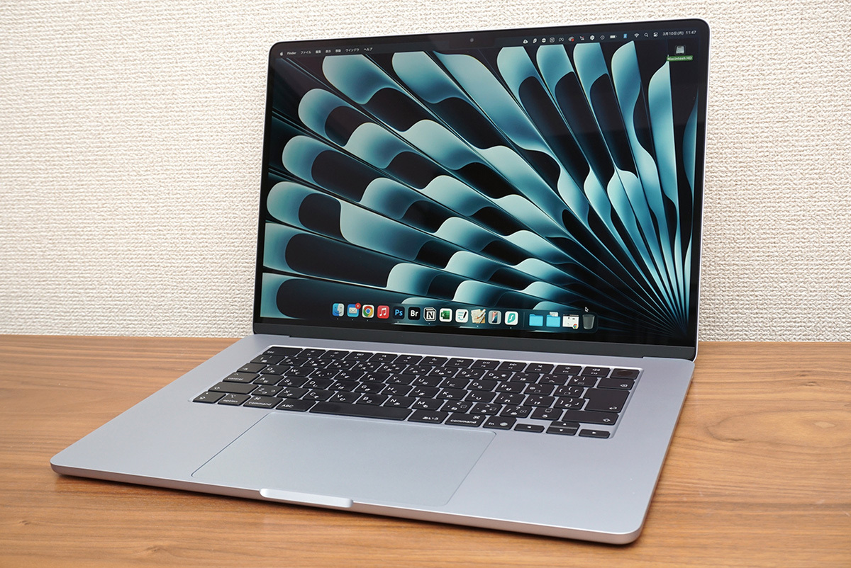 MacBook Airの魅力は薄くて軽いのにパワフルなモバイルノートであることです。今回筆者が試用したモデルは大きい方の15インチですが、やはりスリムで携帯性に優れていると感じます。