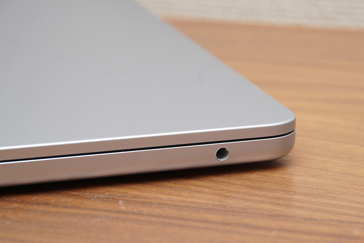 もう片側の側面にはハイインピーダンスヘッドホンの接続ができる3.5mmヘッドホンコネクタがあります。MacBook Airは最大96kHz/24bitのリニアPCMオーディオ信号をデコードできるハードウェアDACを載せています。ハイレゾ対応の有線ヘッドホン・イヤホンを直接コネクタにつないでApple Musicのハイレゾロスレス音源がいい音で楽しめます。