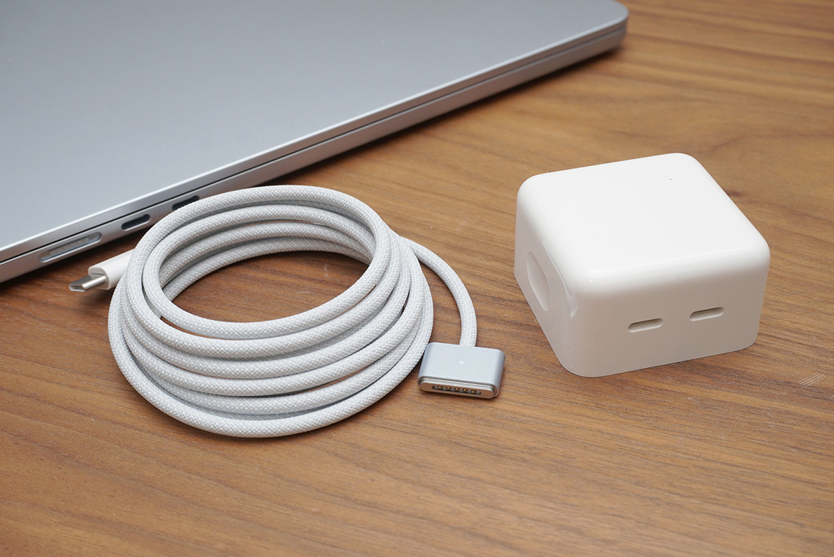 15インチのMacBook Airには2基のUSB-Cポートを搭載する35Wコンパクト電源アダプターが付属します。これが出張の際にとても便利です。Apple Storeで単体で買うと8800円もするので、15インチのパッケージ価格に含まれていることをわかっていながら「ラッキー!」とうれしくなってしまいます。電源ケーブルはコネクタ、被服の色をスカイブルーの本体に統一しています。