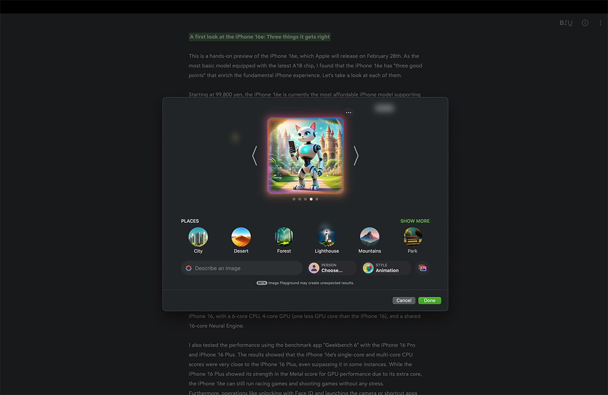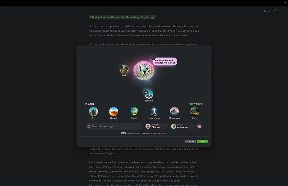 海外の友人や知人に「新しいiPhoneの感想」を伝えるときにも役立ちそうです。Bearには画像生成のImage Playgroundを直接呼び出せるメニューもあるので、イラストを画像をつくって貼り付けるとそれなりにリッチに見えるレポートになりました。