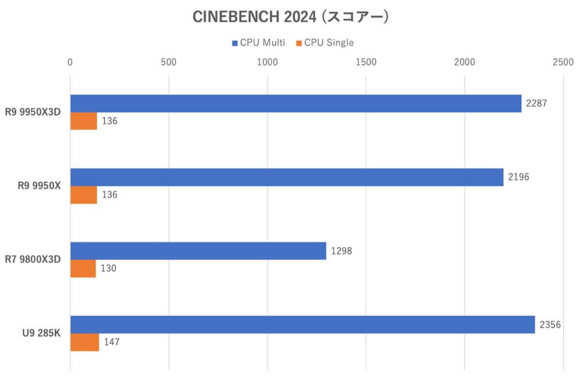 Ryzen 9 9950X3DのマルチスレッドスコアーはRyzen 9 9950Xよりも4%程度高くなったが、シングルスレッドスコアーは同じだった。Ryzen 9 9950X3DのブーストクロックやTDPがRyzen 9 9950Xより高いわけではないためこの差はどこから来るのか判然としない(CPUクーラーの付け方も疑ったが、空振りであった)が、個体差にしてはやや大きい気がする。