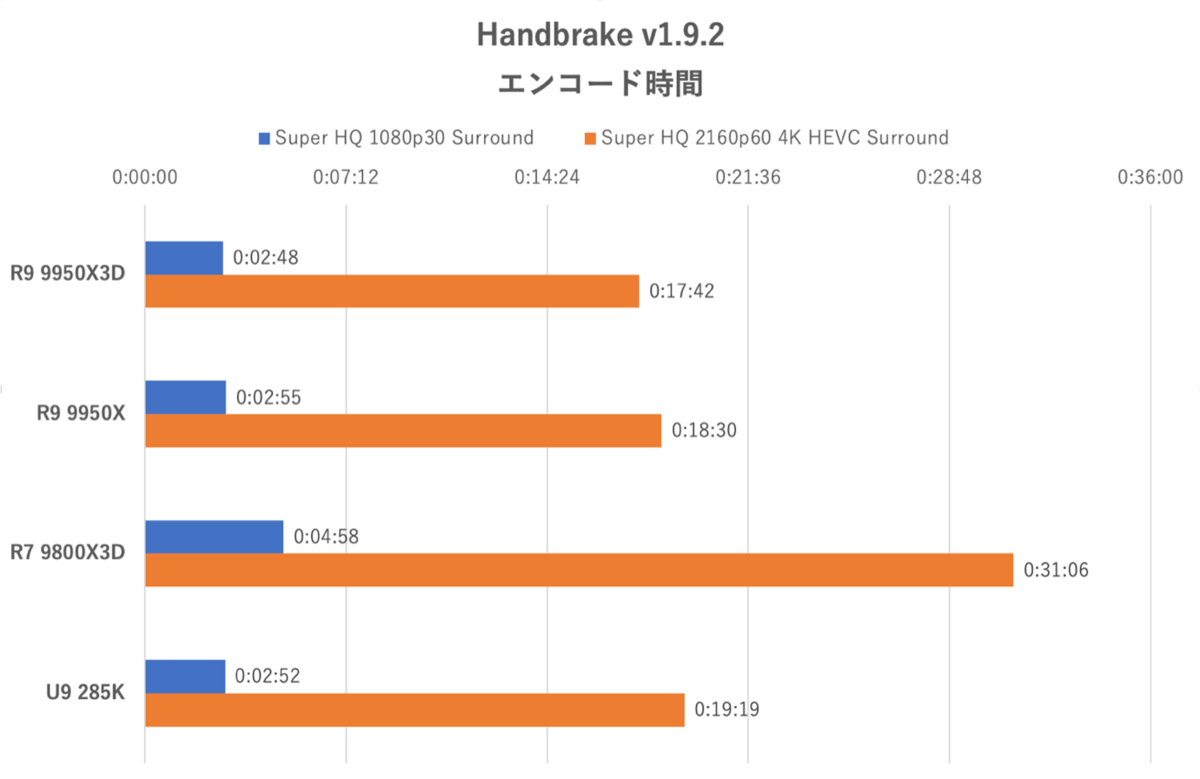 続いて消費電力の検証に入るが、その前提となるテストの結果をみておこう。ここでは「Handbrake」を利用し、再生時間約3分のMP4動画(H.264/ 60fps)をプリセットである「Super HQ 1080p30 Surround」ならびに「Super HQ 2160p60 4K HEVC Surround」でCPUエンコードする際の時間を計測した。