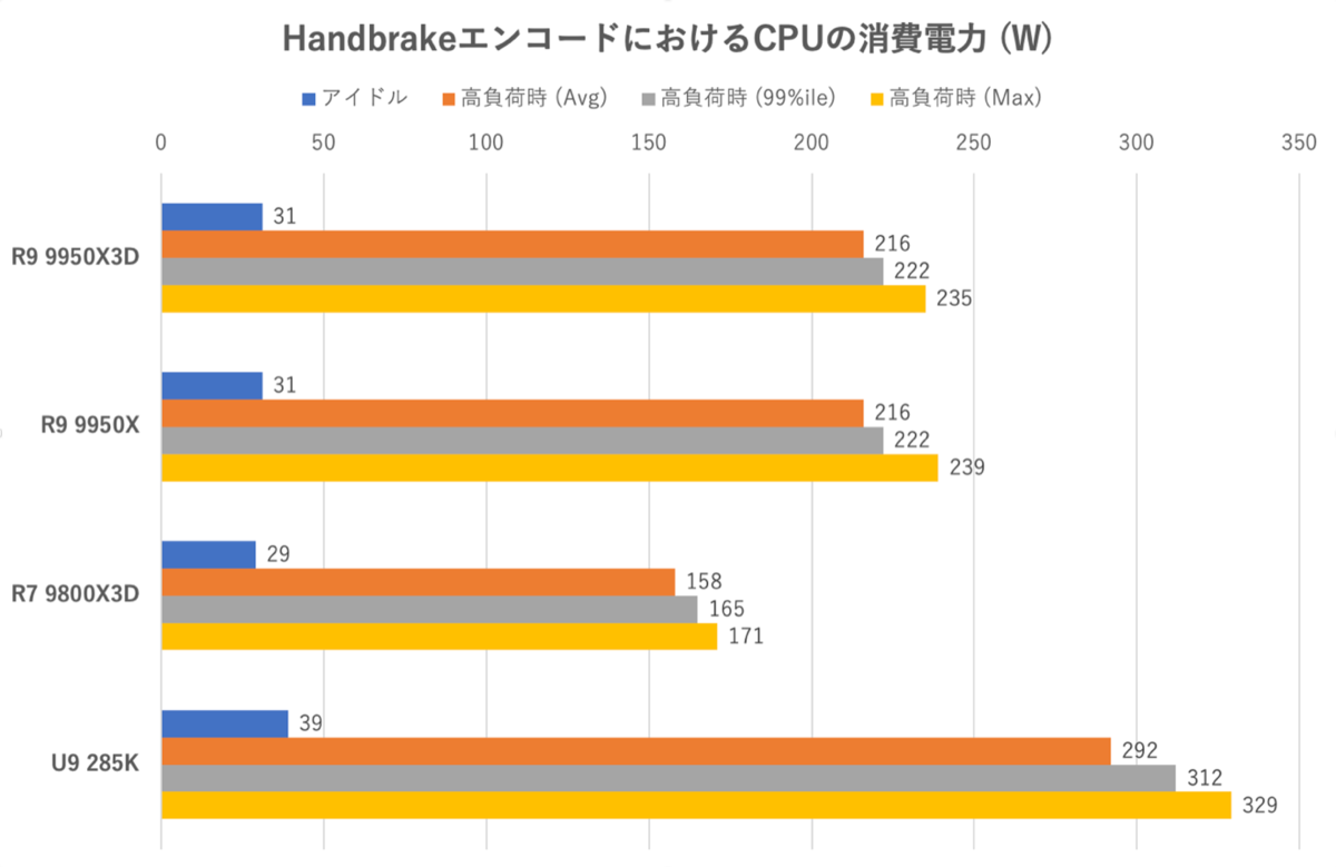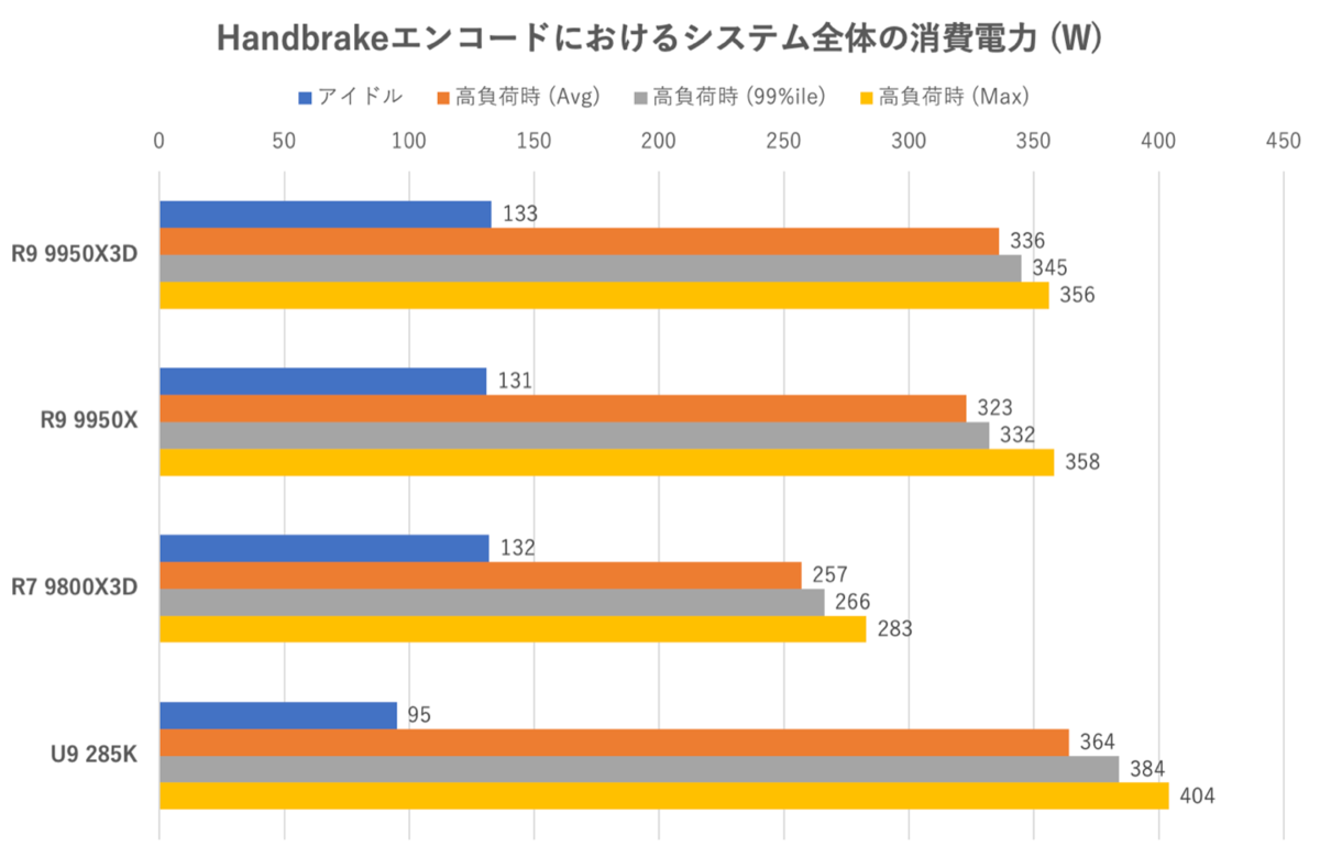 Core Ultra 9 285Kはエンコード時間においてRyzen 9 9950X3Dより遅いにもかかわらずCPU単体の消費電力だけで見ても70W以上多く消費している。ワットパフォーマンスという点においてインテル製CPUはRyzen 9 9950X3Dと同じ土俵に立てていないことが再確認できた。