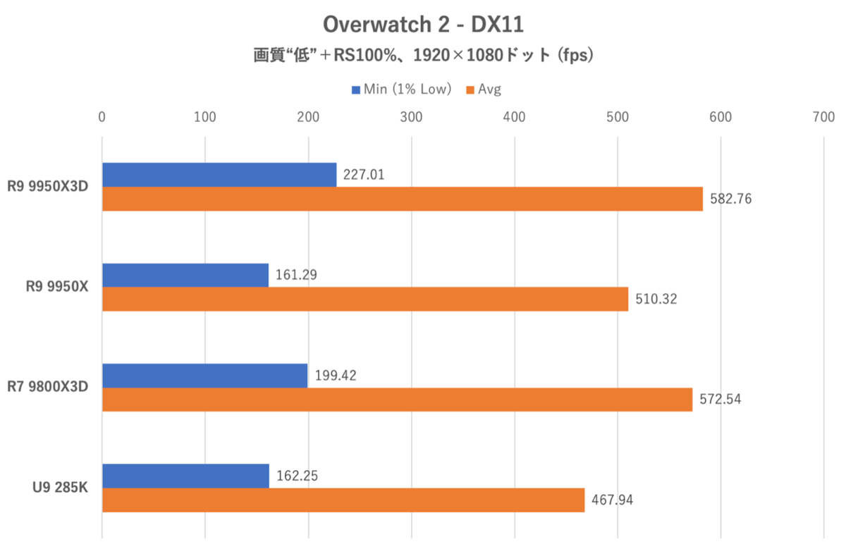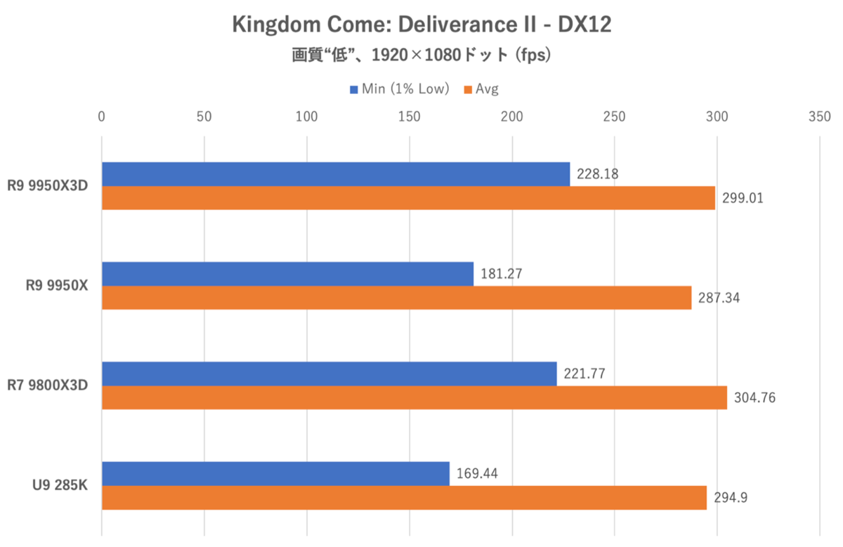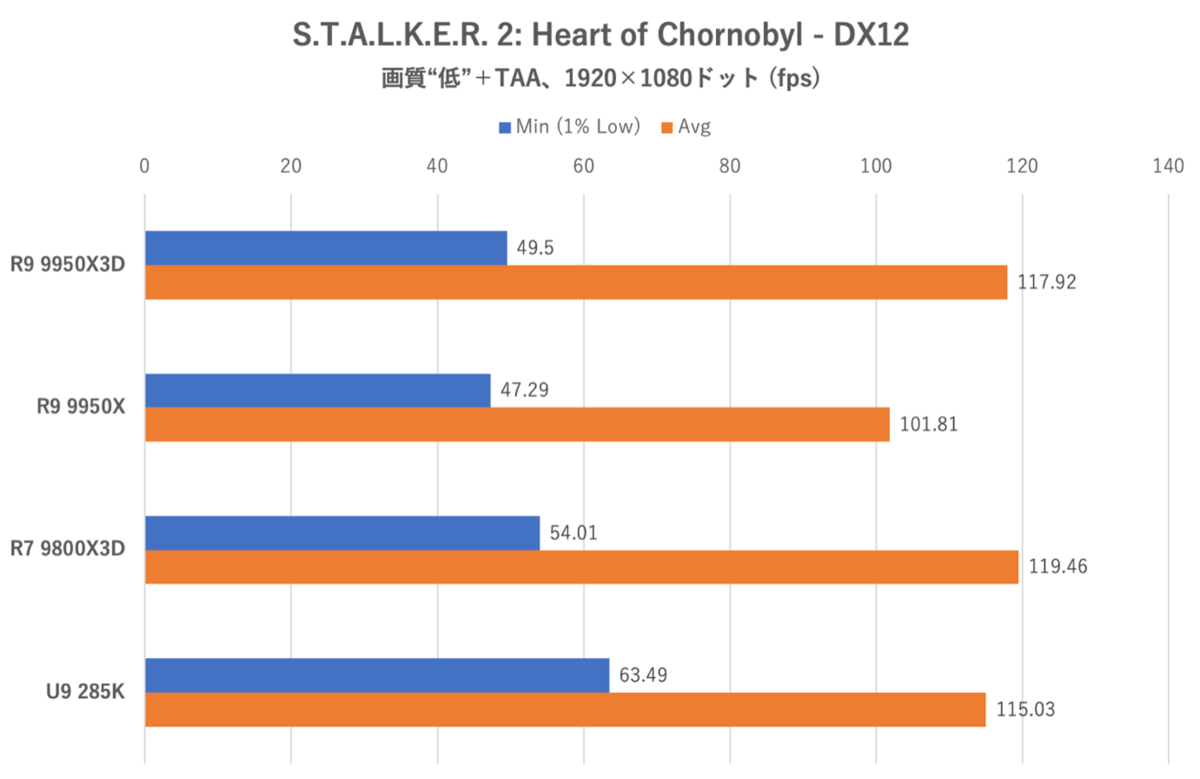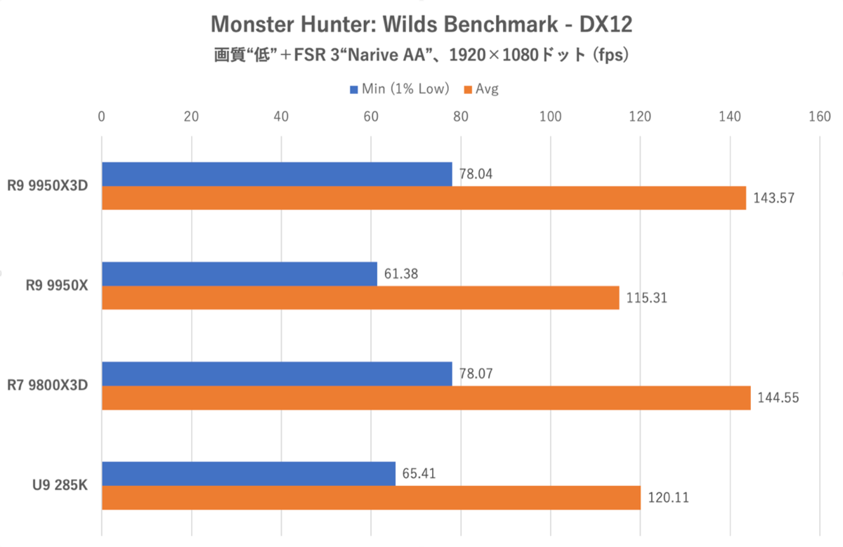 フルHDかつ画質も抑えているため超高fpsが出るかと思っていたが、実際は平均144fpsあたりで頭打ち(V-Syncの影響ではない)になってしまった。Ryzen 9 9950X3Dは9950XやCore Ultra 9 285Kに対してはアドバンテージがあるものの、Ryzen 7 9800X3Dと横並びの結果になった。