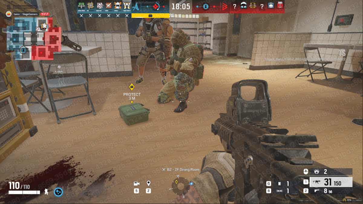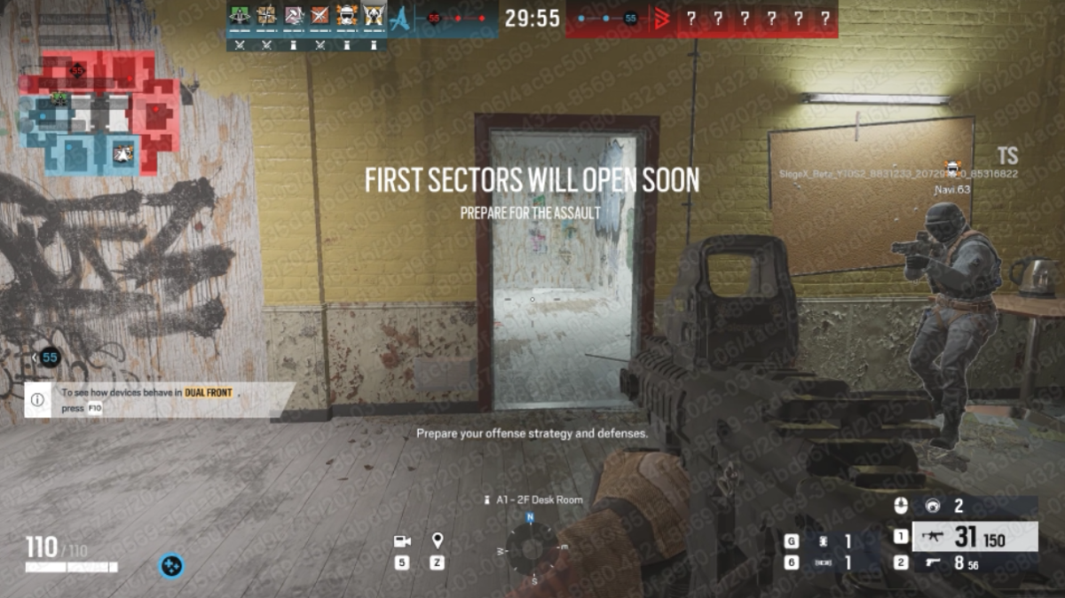 DUAL FRONTは、通常の5対5とは異なり、6対6の対戦となる。特徴はいくつかあるが、まずはオペレーターだが、攻守どちらのオペレーターがピック可能。これにより、ミラのブラックミラーの少し上を、マーヴェリックのブリーチングトーチで開けるなど、新たなオペレーター同士のシナジーを生むこと可能だ。なお、倒されてもリスポーン可能だが、リスポーンまでの時間は結構長めだった。
