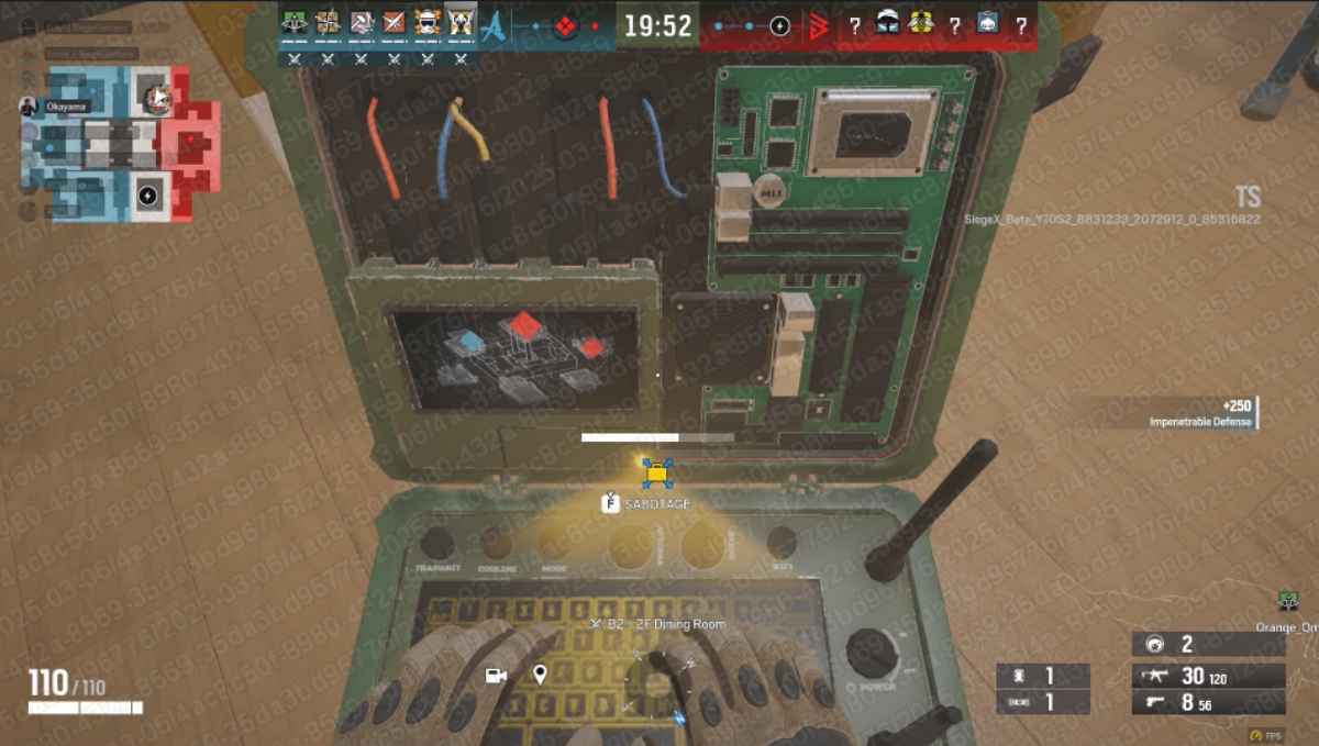 続いてマップ。こちらはDUAL FRONTオリジナルのマップとなっており、通常のマップと比べるとかなり広い。加えて、味方エリアと敵エリアに分かれており、プレイヤーは攻撃に行くオペレーターと、守るオペレーターに分かれたり、敵のスキをついて全員で攻撃しに行ったりと、戦略の幅も広い。ルールは、先に敵の拠点を2つ制圧したうえで、本拠地も獲ることができれば勝利となる。拠点の制圧は、通常マッチと同じく攻撃側はデフューザーを設置し、一定時間経てば占拠完了となる。防衛側は、解除することで防ぐことができる。