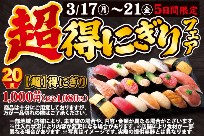 お寿司が20貫1080円! つまり1貫54円の驚異的コスパ! 3月17日から5日間限定「超得にぎり20貫」🍣