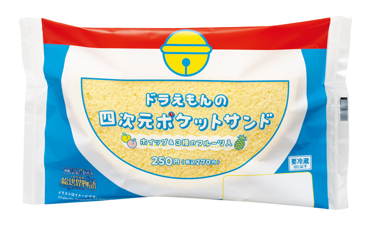 「ドラえもんの四次元ポケットサンド」はホイップと3種のフルーツ(黄桃、白もも、パイン)をサンドしたフルーツサンドで、四次元ポケットをイメージした商品です。