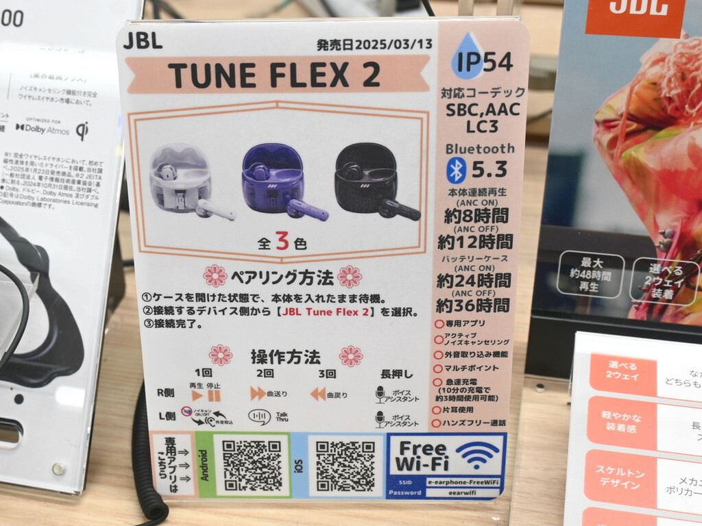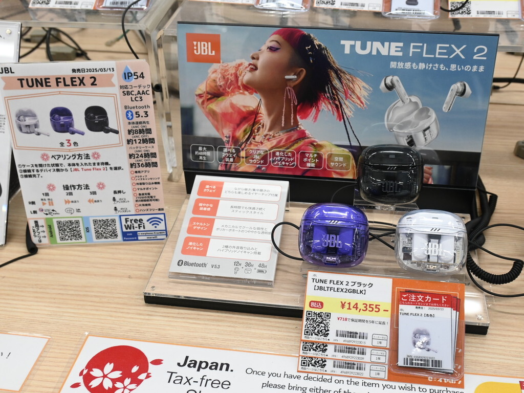 2つの異なるスタイルを使い分けることができる、JBLブランドのワイヤレスイヤホン「JBL Tune Flex 2」が発売。e☆イヤホン秋葉原店本館にて、店頭価格1万4355円で販売されている。