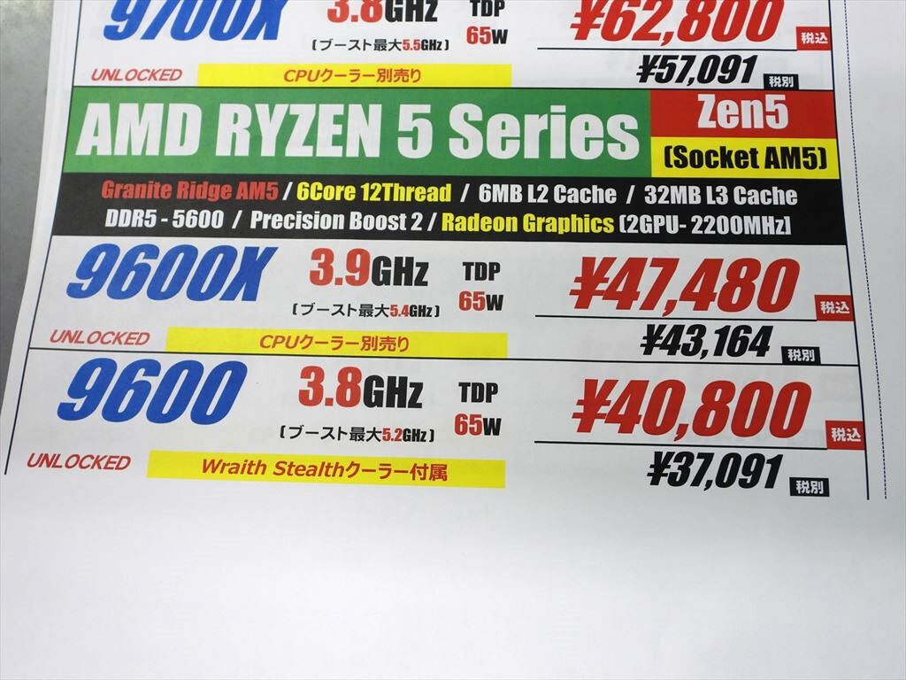AMD Ryzen 9000シリーズの最下位モデル「Ryzen 5 9600」が発売された。価格は4万800円。秋葉原ではパソコンショップアーク、ツクモパソコン本店、TSUKUMO eX.で販売中だ。