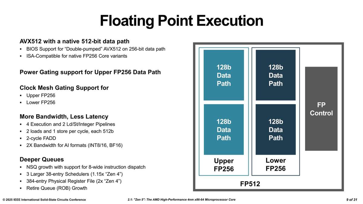 これがZen 5世代になると内部のデータパスが512bit化されたことで、1サイクルあたり2つのAVX-512命令を実行可能になった。それはいいのだが、そのZen 5のFPU内部のデータパスが下の画像である。