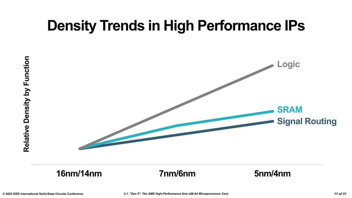 次に物理実装の話だ。プロセスノードを進めても、必ずしもすべてのものが連動して密度が向上するわけではない。ロジック、つまりトランジスタ1個の面積が一番アグレッシブに微細化が進むが、配線の微細化はもっとゆっくり進む。理由は連載809回のインテルのIEDMの発表のところでも述べたが、もう銅配線はこれ以上微細化を進めると配線抵抗が大きくなり、かつエレクトロマイグレーションの影響がシャレにならないほど大きくなるためである。