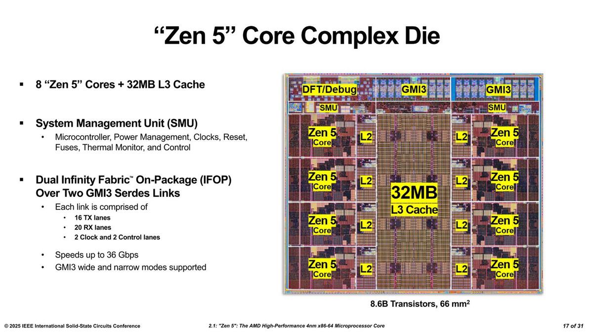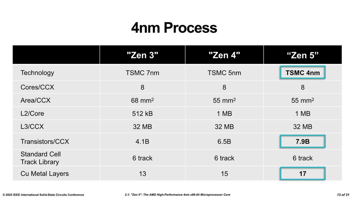 結果として、Zen 4とZen 5を比較した場合、トランジスタの数はCCXあたり65億個から79億個まで増えたのに同じ面積に抑え込めた、としている。ただ配線層が17層に増えているあたりは、配線密度が上げられないので層数を増やしてなんとか対応できた、ということが見て取れる。