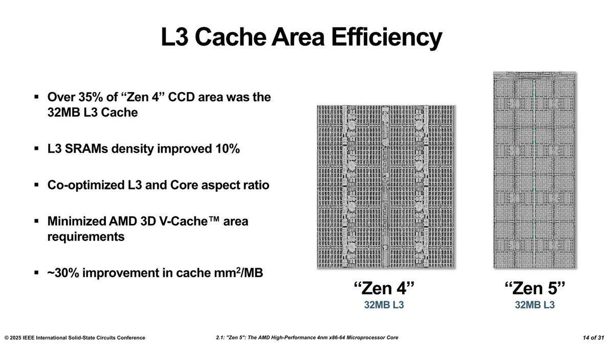 この最適化の結果、Zen 4とZen 5ではずいぶん3次キャッシュの形が変わった。Zen 4ではCCDの面積の35%を占めていたのが、大幅に改善した模様だ。ラフに言えばZen 4時代の3次キャッシュは36mm2ほどの面積だったが、これが28mm2ほどに縮小されたようだ。