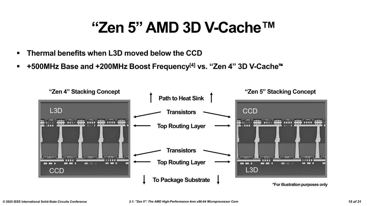 ところでZen 5世代では3D V-Cacheの位置がZen 4世代までと逆になる、という話があったが、その模式図が下の画像だ。Zen 4世代は以下の形に改まった。