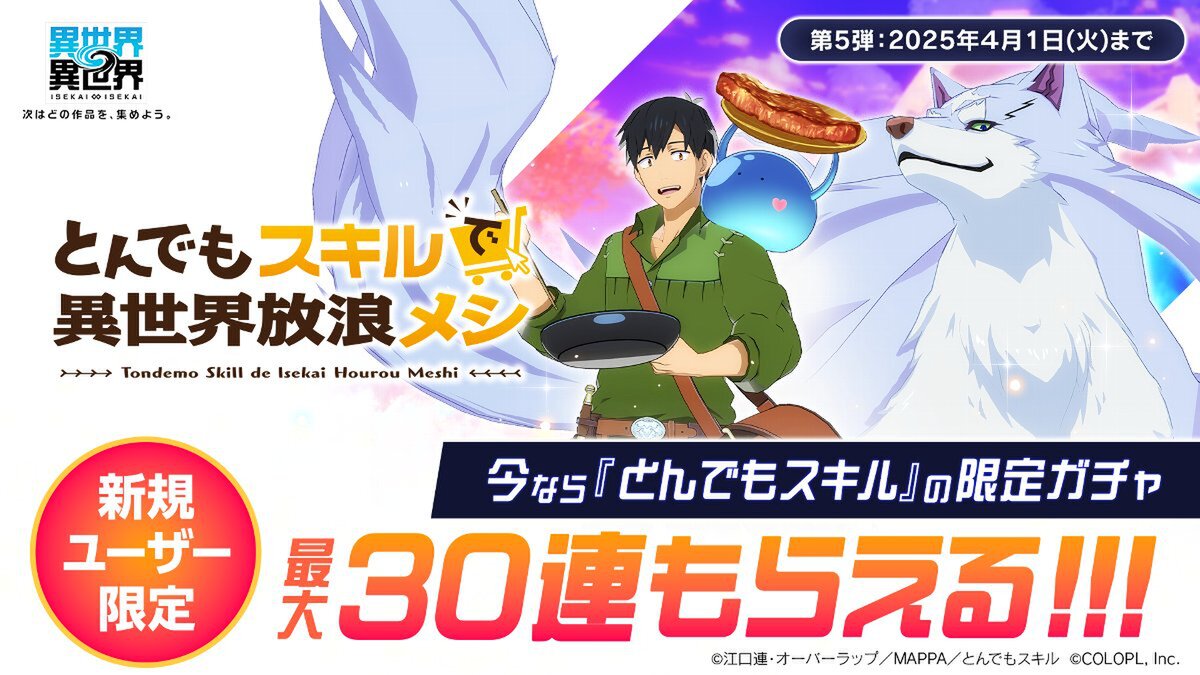 コロプラは3月17日、iOS/Android/PC(Steam)向けもっと異世界を楽しむゲーム『異世界∞異世界』(いせかいいせかい)にて、「1stシーズン」第5弾として、TVアニメ作品「とんでもスキルで異世界放浪メシ」とキャラクターたちが登場したと発表。