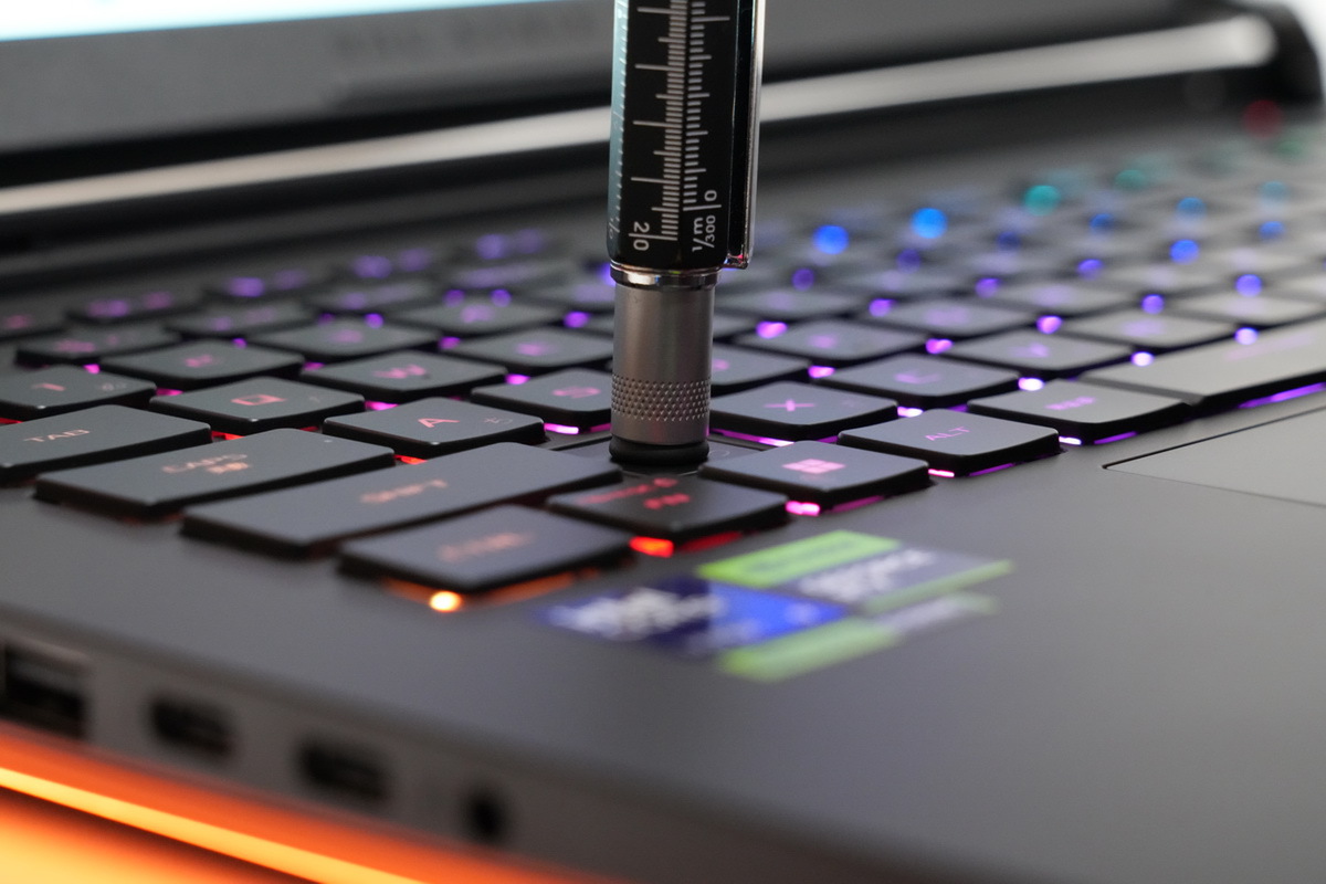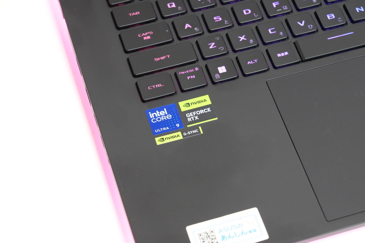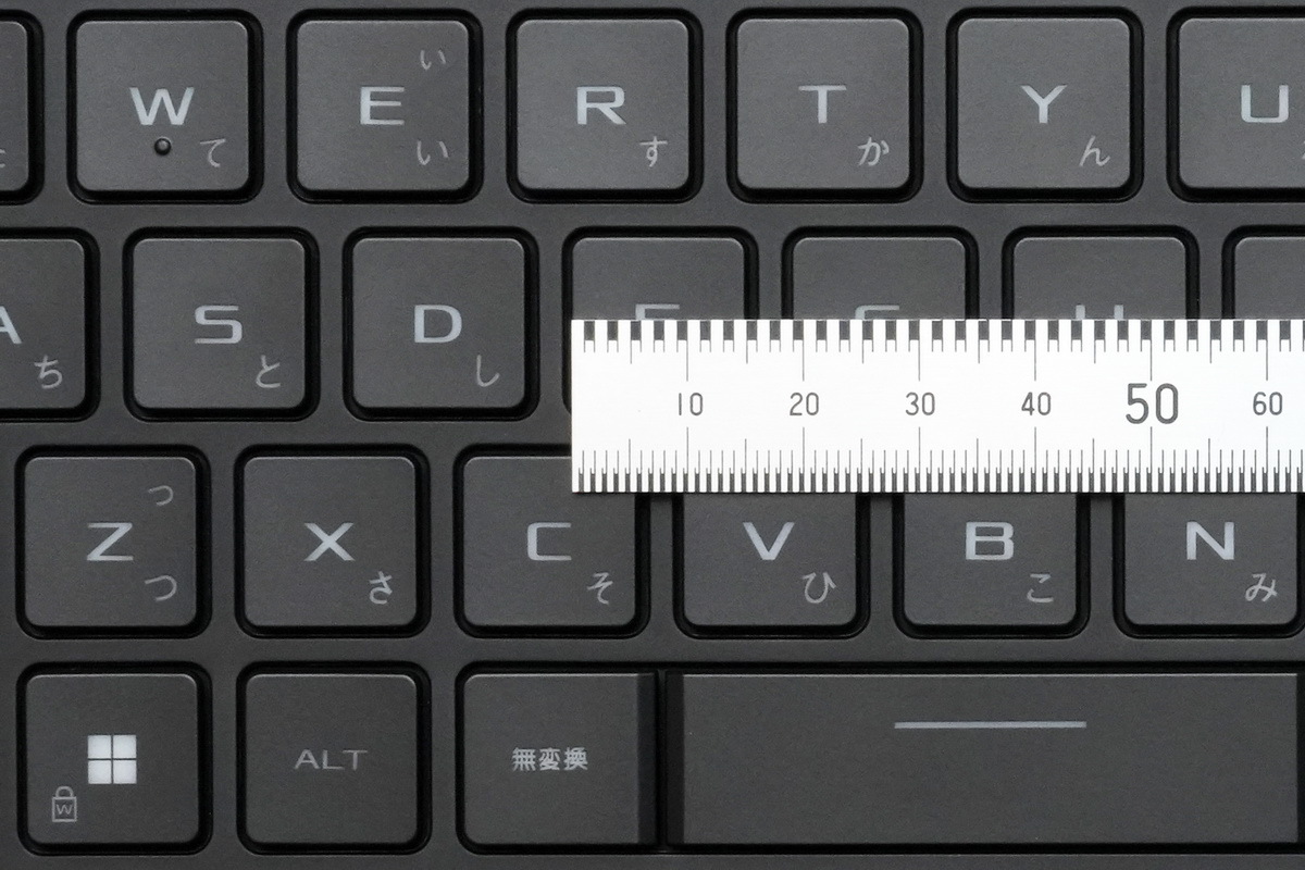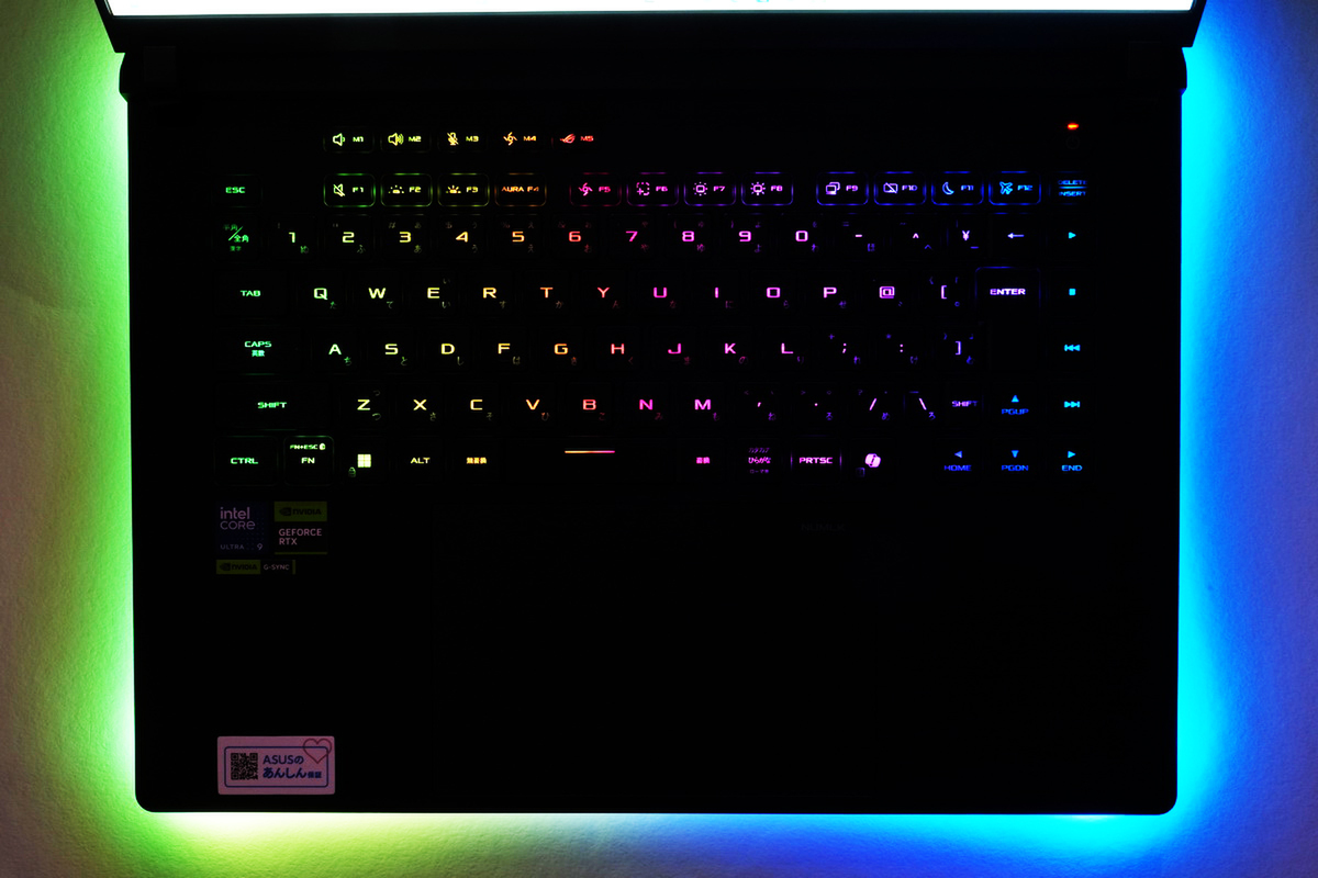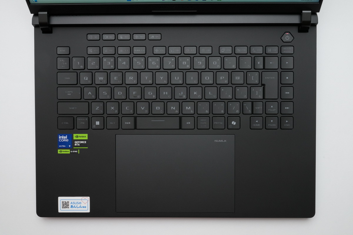 「ROG Strix SCAR 16」のキーボードは92キーの日本語配列で、キーピッチは実測19mm前後、キーストロークは実測1.7~1.8mm。キーボード面の剛性は非常に高く、打鍵感がよい。かなり強くタイピングしても底打ちの音は低めだ。もちろんゲーミングノートPCということで、複数キーの同時押しが可能な「Nキーロールオーバー」に対応。かなり上質なキーボードと言える。