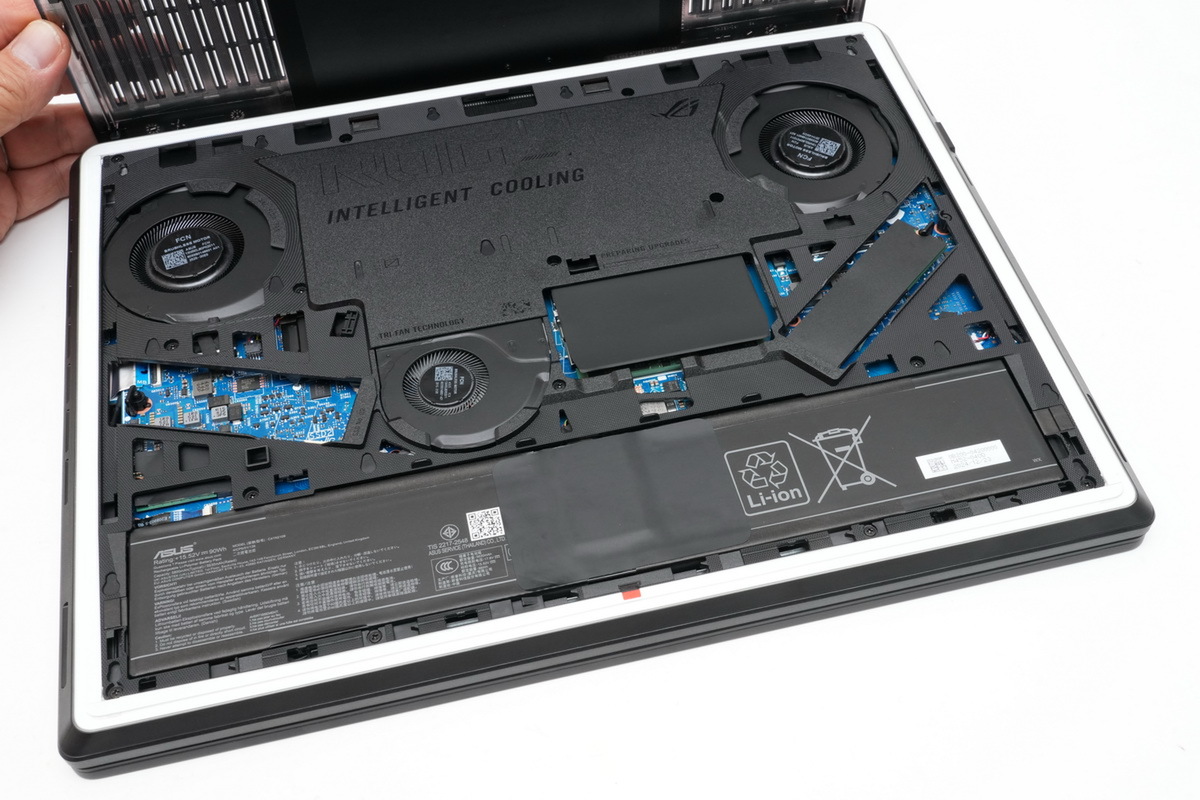 またゲーミングノートPCの弱点とされているメンテナンス性、拡張性についても、ツールレスで底面パネルをはずし、メモリー、ストレージを増設・換装できる新設計シャーシにより改善しているのもポイントだ。