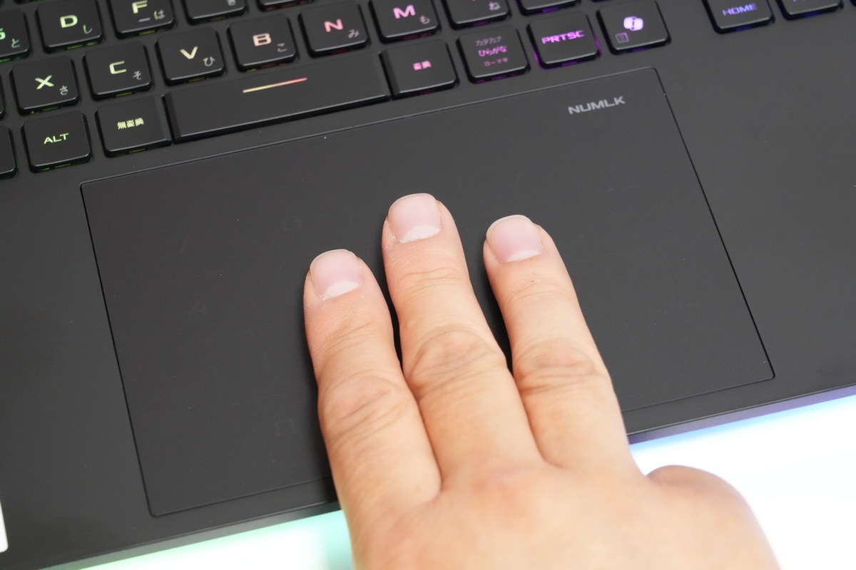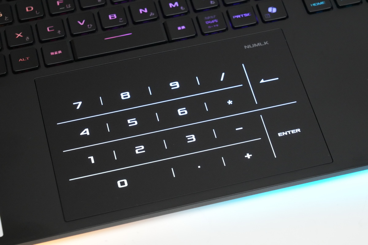 逆に個人的に「気に入っている」のが、実測150×99mmの「NumberPad タッチパッド」。スペースが広いのでジェスチャー操作しやすく、また右上の「NUMLK」を長押しすると、テンキーとして利用可能となる。経理仕事をしない方でも、確定申告の時期には非常に重宝する。テンキーで操作するレトロゲームなどでも活躍してくれそうだ。